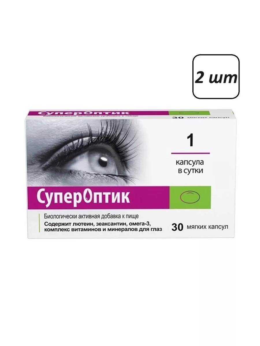 Супероптик - это биологически активная добавка (БАД) к пище в виде капсул, который содержит набор полезных витаминов и минералов, необходимых для здоровья глаз и улучшения зрения. В составе капсул присутствуют такие вещества, как: лютеин, зеаксантин, ПНЖК омега-3, витамины А, С, Е, В1, В2, В6, В12, а также микроэлементы цинк, медь и селен и др. Эти вещества помогают улучшить зрительную функцию и предупреждают возникновение возрастных изменений глаз. Капсулы можно использовать в качестве дополнительного источника витаминов и минералов для тех, кто хочет сохранить или улучшить свое зрение. Принимать внутрь, по одной капсуле в день, запивая небольшим количеством жидкости. Рекомендуется принимать во время еды. Не разжевывать и не рассасывать. Не превышать рекомендуемую суточную дозу. В упаковке находится 30 капсул - достаточно для месячного курса приема