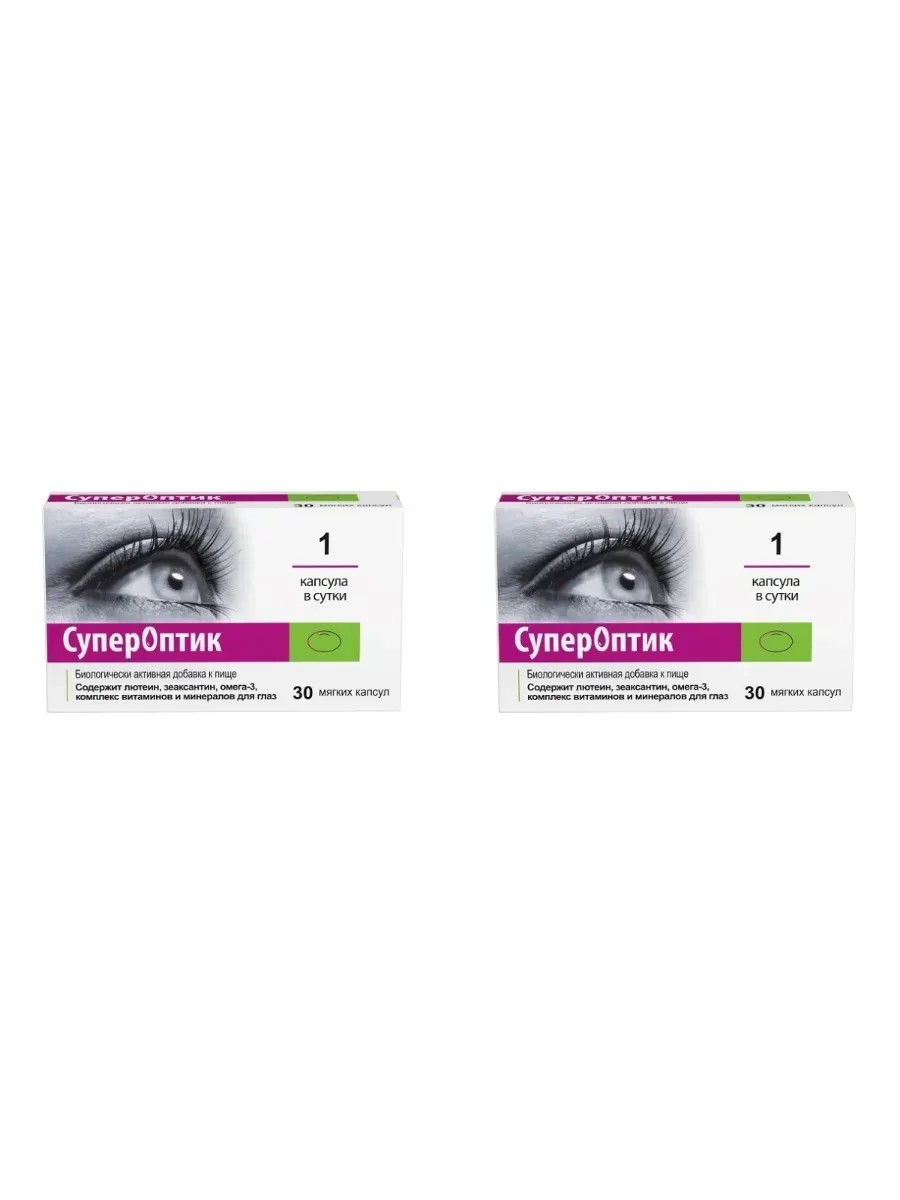 Супероптик - это биологически активная добавка (БАД) к пище в виде капсул, который содержит набор полезных витаминов и минералов, необходимых для здоровья глаз и улучшения зрения. В составе капсул присутствуют такие вещества, как: лютеин, зеаксантин, ПНЖК омега-3, витамины А, С, Е, В1, В2, В6, В12, а также микроэлементы цинк, медь и селен и др. Эти вещества помогают улучшить зрительную функцию и предупреждают возникновение возрастных изменений глаз. Капсулы можно использовать в качестве дополнительного источника витаминов и минералов для тех, кто хочет сохранить или улучшить свое зрение. СуперОптик - это комплекс биологически активных веществ, обладающих защитным действием на структуры глаза, который оказывает положительное влияние на функцию зрительного аппарата. СуперОптик содержит биологически активные вещества, которые предназначены в основном для защиты от повреждения желтого пятна сетчатки и хрусталика. Желтое пятно - это центральная и наиболее чувствительная часть сетчатки глаза. От нормального функционирования желтого пятна сетчатки зависит острота зрения. К факторам, неблагоприятно влияющим на функционирование желтого пятна, относятся: возраст, табакокурение, многолетнее воздействие на глаза интенсивного света (ультрафиолетовое излучение), а также дефицит, так называемых, антиоксидантов. Кроме защиты глаз от неблагоприятного влияния факторов окружающей среды, вещества, входящие в состав СуперОптик, снимают симптомы усталости глаз, вызванные длительной зрительной концентрацией, способствуют повышению остроты зрения и улучшают адаптацию зрения в темноте. Такой эффект действия обеспечивается оптимально подобранным составом продукта.