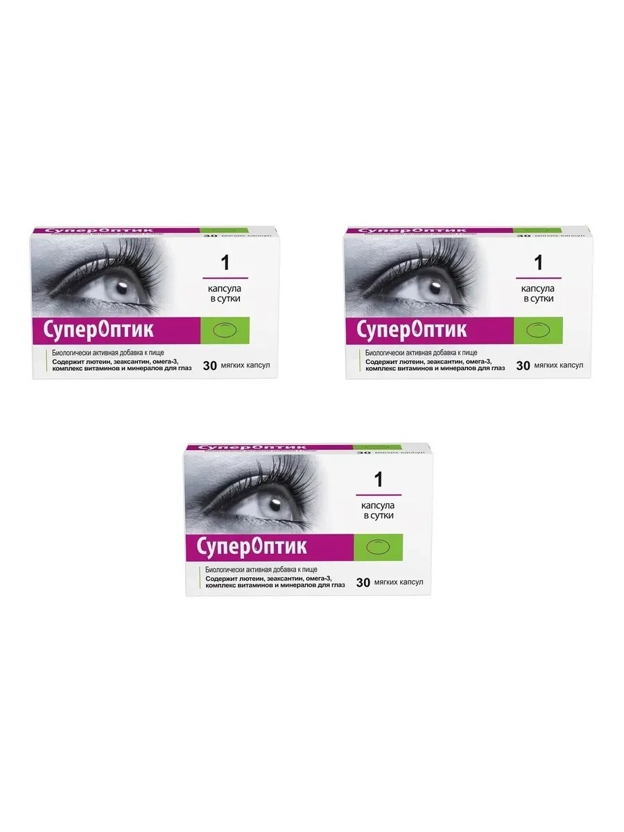 Супероптик - это биологически активная добавка (БАД) к пище в виде капсул, который содержит набор полезных витаминов и минералов, необходимых для здоровья глаз и улучшения зрения. В составе капсул присутствуют такие вещества, как: лютеин, зеаксантин, ПНЖК омега-3, витамины А, С, Е, В1, В2, В6, В12, а также микроэлементы цинк, медь и селен и др. Эти вещества помогают улучшить зрительную функцию и предупреждают возникновение возрастных изменений глаз. Капсулы можно использовать в качестве дополнительного источника витаминов и минералов для тех, кто хочет сохранить или улучшить свое зрение. СуперОптик - это комплекс биологически активных веществ, обладающих защитным действием на структуры глаза, который оказывает положительное влияние на функцию зрительного аппарата. СуперОптик содержит биологически активные вещества, которые предназначены в основном для защиты от повреждения желтого пятна сетчатки и хрусталика. Желтое пятно - это центральная и наиболее чувствительная часть сетчатки глаза. От нормального функционирования желтого пятна сетчатки зависит острота зрения. К факторам, неблагоприятно влияющим на функционирование желтого пятна, относятся: возраст, табакокурение, многолетнее воздействие на глаза интенсивного света (ультрафиолетовое излучение), а также дефицит, так называемых, антиоксидантов. Кроме защиты глаз от неблагоприятного влияния факторов окружающей среды, вещества, входящие в состав СуперОптик, снимают симптомы усталости глаз, вызванные длительной зрительной концентрацией, способствуют повышению остроты зрения и улучшают адаптацию зрения в темноте. Такой эффект действия обеспечивается оптимально подобранным составом продукта.