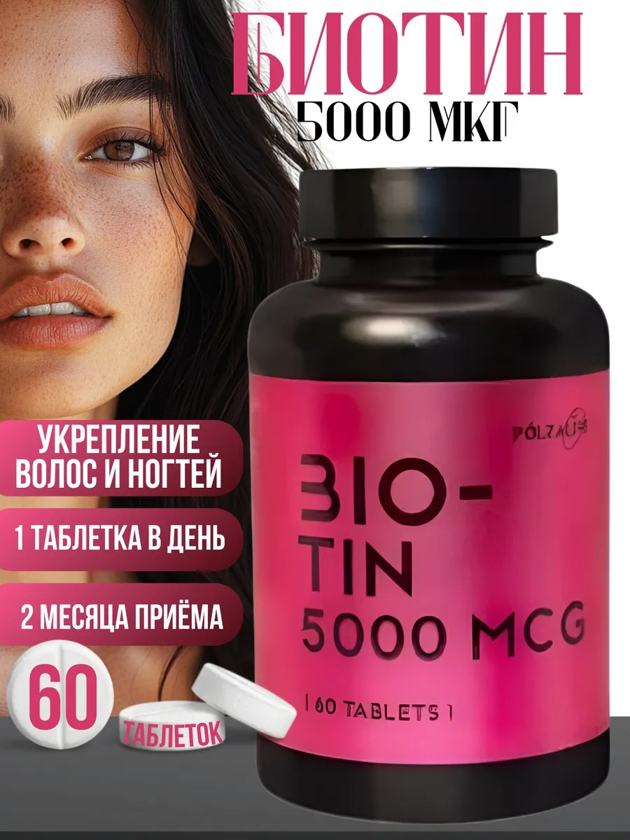 Vitamin Biotin from PolzaLife is a readily available source of vitamin B7, also known as Vitamin H or the beauty vitamin, which is very popular among women. Biotin belongs to the group of water-soluble B vitamins. The main functions of vitamin B7 are to maintain healthy hair, skin, and nails. Biotinal tablets for hair loss strengthen hair follicles, making hair stronger, thicker, and shinier. Biotin B7 (H) strengthens the structure of nails, preventing brittleness and splitting. Using the dietary supplement Biotin makes skin more elastic, improves its appearance, and prevents peeling. Vitamin B helps normalize metabolism and maintain overall vitality.