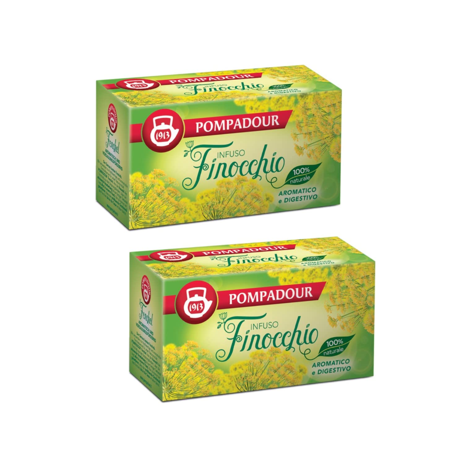 A constant pursuit of quality. From 1964 to the present day, the POMPADOUR brand has become a symbol of quality, responsibility, and excellence: a success story marked since its inception by a strong commitment to innovation. With over 100 products, POMPADOUR now offers the largest selection on the Italian market. On July 14, 1882, the parent company R. Seelig and Hille Sas was founded in Dresden. In 1892, Rudolf Anders and Eugen Nissle, two young, pioneering entrepreneurs, took over the company and introduced one of the most revolutionary innovations in the tea market: they began selling pre-packaged tea blends. Until then, loose-leaf tea could only be purchased in specialty shops, where it was sold in large aluminum tins. Anders and Nissle, however, began offering it already packaged, introducing the idea that this way the tea was better preserved hygienically and retained its aroma. These elegant boxes, made of shiny gold and silver paper, resembled small jewels and immediately won over women, who frequently bought them and brought them home as precious gifts. This insight laid the foundation for the company's success and its future international renown. - "Fennel Infusion": Since ancient times, fennel has been one of the most popular and highly valued infusions. It is prepared using fennel seeds, which possess remarkable properties. In folk tradition, the infusion is most useful for soothing the stomach and naturally reducing the uncomfortable sensation of bloating. In addition to all its beneficial properties, fennel infusion has a naturally sweet and fragrant taste and is a pleasant drink, particularly suitable after meals. Naturally gluten-free, suitable for a gluten-free diet. INGREDIENTS Fennel seeds. INSTRUCTIONS To prepare the infusion, pour boiling water over the tea bag and let it steep for 5 to 10 minutes. See morePompadour 1913 Infusion de fenouil aromatique et digestif 100 naturel - 2 x 20 sachets de thé (80 grammes)DESCRIPTION DU PRODUIT DESCRIPTION DU PRODUIT Recherche constante de qualité. De 1964 à aujourd'hui, la marque POMPADOUR est devenue un symbole de qualité, de responsabilité et d'excellence: une success story, marquée depuis sa création par une forte volonté d'innovation. Avec plus de 100 produits, POMPADOUR propose aujourd'hui le plus grand assortiment du marché italien. Le 14 juillet 1882, la société mère R. Seelig et Hille Sas a été fondée à Dresde, en 1892 Rudolf Anders et Eugen Nissle, deux jeunes entrepreneurs à l'esprit pionnier, reprennent l'entreprise et introduisent l'une des innovations les plus révolutionnaires sur le marché du thé: à autrefois, ils commercialisent des mélanges de thé emballés. Jusque-là, le thé ne pouvait être acheté en vrac que dans les mags spécialisés, où il se trouvait dans de grandes boîtes en aluminium. Anders et Nissle, cependant, commencent à le proposer déjà emballé, introduisant l'idée que de cette façon, le thé est mieux conservé d'un point de vue hygiénique et conserve mieux son arôme. Ces coffrets élégants, en papier brillant or et argent, ressemblent à de petits bijoux et conquièrent immédiatement les femmes, qui les achètent fréquemment et les apportent chez elles comme un cadeau précieux. Cette intuition pose les bases du succès de l'entreprise et de sa future renommée internationale. - "Infusion de fenouil": depuis l'Antiquité, le fenouil est l'une des infusions les plus appréciées et les plus appréciées. Pour sa préparation, on utilise des graines de fenouil, qui contiennent des propriétés remarquables. Dans la tradition populaire, l'infusion trouve sa plus grande utilité pour soulager l'estomac et pour réduire naturellement la sensation gênante de gonflement abdominal. En plus de toutes ses vertus bienfaisantes, l'infusion de fenouil a un goût naturellement sucré et parfumé et est une boisson agréable particulièrement adaptée après les repas. Naturellement sans gluten, adapté à un régi. INGRÉDIENTS Graines de fenouil. MODE D'EMPLOI Pour préparer l'infusion, versez de l'eau bouillante sur le sachet de thé et laissez infuser pendant 5 à 10 minutes. Voir plus