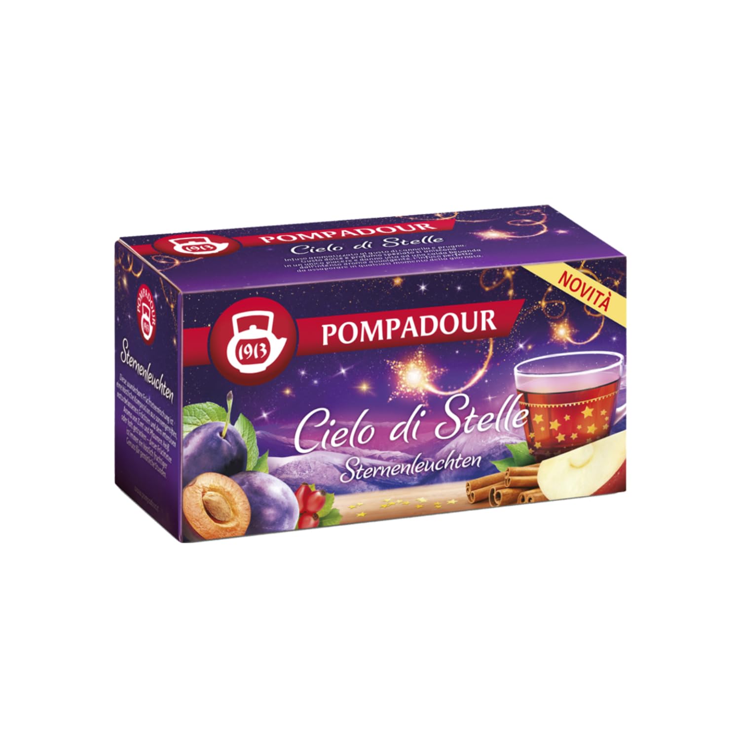 Pompadour Tea is constantly striving for quality. From 1964 to the present day, the POMPADOUR TE' brand has become a symbol of quality, responsibility, and excellence: a success story marked from its inception by a strong drive for innovation. With over 100 products, Pompadour Tea now offers the largest selection on the Italian market. On July 14, 1882, the parent company R. Seelig and Hille Sas was founded in Dresden. In 1892, Rudolf Anders and Eugen Nissle, two young, pioneering entrepreneurs, took over the company and introduced one of the most revolutionary innovations in the tea market: they were the first to market tea blends in packages. Until then, tea could only be purchased loose in specialty shops, where it was sold in large aluminum tins. However, Anders and Nissle began offering it already packaged, introducing the idea that the tea was more hygienic and retained its aroma better this way. These elegant boxes, made of shiny gold and silver paper, resembled small jewels and immediately appealed to women, who frequently bought them and took them home as if they were precious gifts. This insight laid the foundation for the company's success and its future international renown. "Starry Sky": Fruit blend flavored with cinnamon and plum for infusion (20 tea bags - 50 grams). Made in Germany. Caffeine-free. [THE BRAND] - Since 1964, the Pompadour Tea 1913 brand has become a symbol of quality, responsibility, and excellence. A success story marked from the outset by a strong drive for innovation. [THE FILTER] - One of the most revolutionary innovations in the tea market was marketing it in packages. Pompadour introduced this method, introducing the idea that the tea would keep better and retain its aroma. [Starry Sky] - Flavored infusion with cinnamon and. INGREDIENTS Hibiscus, apple, rosehip, meringue flavoring 5 , cream flavoring, stevia leaves, raspberry flavoring 3 , raspberry. Gluten-free. INSTRUCTIONS Prepare the infusion with hot water. SAFETY WARNING For adults, do not use during pregnancy or breastfeeding. Keep out of reach of children. See morePompadour Mix Fruits Cannelle et Prune Infusion de pomme, cannelle, prune et clou de girofle - 20 Filtres (50 Gr) Tisane Ciel d'ÉtoilesDESCRIPTION DU PRODUIT DESCRIPTION DU PRODUIT Pompadour Te'à la recherche constante de la qualité. Depuis 1964 à aujourd'hui, la marque POMPADOUR TE' est devenue un symbole de qualité, de responsabilité et d'excellence : une histoire de réussite, marquée depuis la naissance par une forte poussée à l'innovation. Avec plus de 100 produits, Pompadour Te' offre aujourd'hui le plus grand assortiment sur le marché italien. Le 14 juillet 1882 est fondée à Dresde la Maison mère R. Seelig et Hille Sas, en 1892 Rudolf Anders et Eugen Nissle, deux jeunes entrepreneurs à l'esprit pionnier, recouvrent l'entreprise et introduisent l'une des innovations les plus révolutionnaires du marché du thé : en premier, ils commercialisent des mélanges de thé en paquet. Jusque-là, le thé ne pouvait être acheté qu'en vrac dans les mags spécialisés, où il était dans de grands lait d'aluminium. Cependant, Anders et Nissle commencent à le proposer déjà emballé dans un paquet, en introduisant l'idée que le thé reste mieux du point de vue hygiénique et en conserve plus l'arôme. Ces boîtes élégantes, faites de papier brillant doré et argent, ressemblent à de petits bijoux et séduisent immédiatement les femmes, qui les achètent fréquemment et les emportent dans leur maison comme si elles étaient un cadeau précieux. Cette intuition pose les bases du succès de l'entreprise et de sa future renommée internationale. « Ciel d'étoiles » : mélange de fruits aromatisé à la cannelle et prune pour infusion (20 sachets de thé - 50 grammes). Fabriqué en Allemagne. Sans caféine [LA MARQUE] - Depuis 1964, la marque Pompadour Teè 1913 est devenue un symbole de qualité, de responsabilité et d'excellence. Une histoire de succès marquée dès la naissance par une forte poussée à l'innovation. [LE FILTRE] - L'une des innovations les plus révolutionnaires du marché du thé a été de le commercialiser en paquet. Pompadour le met en place, en introduisant l'idée, de sorte que le thé se maintienne mieux et en conserve l'arôme. [Ciel d'étoiles] - Infusion aromatisée au goût de cannelle et. INGRÉDIENTS Hibiscus, pomme, églantier, arôme de meringue 5 , arôme de crème, feuilles de stévia, arôme de framboise 3 , framboise. Sans gluten. MODE D'EMPLOI Préparer l'infusion avec de l'eau chaude. AVERTISSEMENT DE SÉCURITÉ Pour les adultes, ne pas utiliser pendant la grossesse ou l'allaitement. Tenir hors de portée des enfants. Voir plus