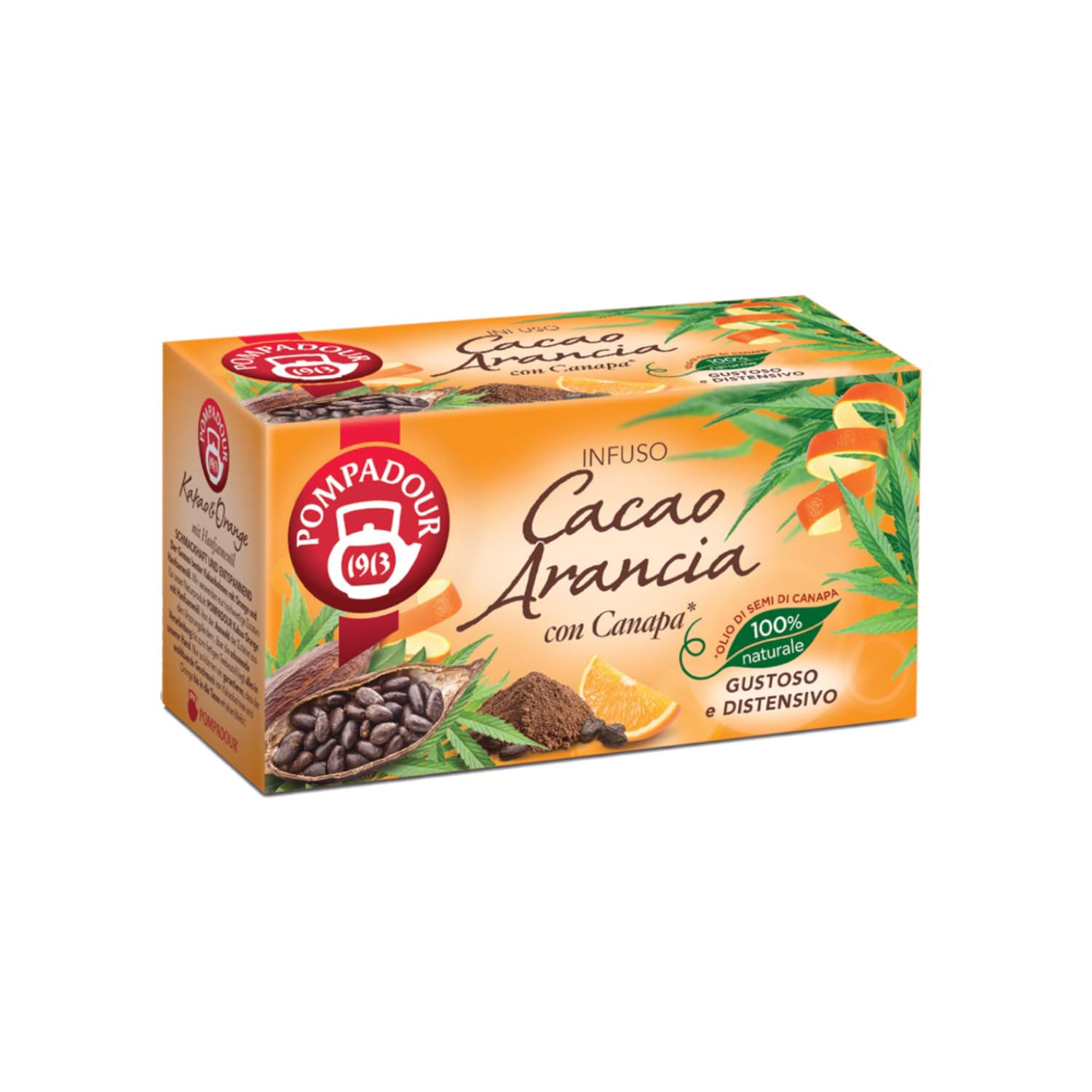 POMPADOUR TE' Constantly striving for quality. From 1964 to the present day, the POMPADOUR TE' brand has become a symbol of quality, responsibility, and excellence: a success story marked from its inception by a strong commitment to innovation. With over 100 products, POMPADOUR TE' now offers the largest selection on the Italian market. The parent company, R. Seelig Hille Sas, was founded in Dresden on July 14, 1882. In 1892, Rudolf Anders and Eugen Nissle, two young, pioneering entrepreneurs, took over the company and introduced one of the most revolutionary innovations in the tea market: they began selling pre-packaged tea blends. Until then, loose-leaf tea could only be purchased in specialty shops, where it was found in large aluminum cans. Anders and Nissle, however, began offering it pre-packaged, introducing the idea that this way the tea was better preserved hygienically and its aroma was better retained. These elegant boxes, made of paper shimmering with gold and silver, resembled small jewels and immediately appealed to women, who frequently bought them and took them home as if they were precious gifts. This intuition laid the foundation for the company's success and its future international renown. "Cacao Orange": cocoa beans and orange for infusion (20 tea bags - 36 grams). Made in Germany. Caffeine-free. [THE BRAND] - From 1964 to the present day, the Pompadour Tè 1913 brand has become a symbol of quality, responsibility, and excellence. A success story marked from its inception by a strong commitment to innovation. [THE FILTER] - One of the most revolutionary innovations in the tea market was selling it in tea bags. Pompadour implemented this by introducing the idea of better preserving the tea's aroma. [CACAO ORANGE] - The flavors. INGREDIENTS Cocoa beans 28 , cocoa nibs 27 , sweet blackberry leaves, cinnamon, ginger, chicory root, cardamom, orange flavoring 4 , orange peel, black pepper. INSTRUCTIONS [INFO] Temperature: boiling water, time: 5-10 minutes, proportion: varies according to personal preference SAFETY WARNING Caffeine-free. Suitable for children. See morePompadour Fèves de Cacao et Orange pour Infusion Relax Tisane Orange Cacao en Sachets - 20 Filtres (36 Gr) Infusion Sans CaféineDESCRIPTION DU PRODUIT DESCRIPTION DU PRODUIT POMPADOUR TE' En recherche constante de qualité. De 1964 à aujourd'hui, la marque POMPADOUR TE' est devenue un symbole de qualité, de responsabilité et d'excellence : une success story, marquée depuis sa naissance par une forte volonté d'innovation. Avec plus de 100 produits, POMPADOUR TE' propose aujourd'hui le plus grand assortiment du marché italien. La société mère R. Seelig et Hille Sas est fondée à Dresde le 14 juillet 1882. En 1892, Rudolf Anders et Eugen Nissle, deux jeunes entrepreneurs à l'esprit pionnier, reprennent l'entreprise et introduisent l'une des innovations les plus révolutionnaires sur le marché du thé. : d'abord, ils commercialisent des mélanges de thé conditionnés. Jusqu'alors, le thé ne pouvait être acheté en vrac que dans les mags spécialisés, où on le trouvait dans de grandes canettes en aluminium. Anders et Nissle commencent cependant à le proposer déjà emballé, introduisant l'idée que de cette manière le thé est mieux conservé d'un point de vue hygiénique et préserve mieux son arôme. Ces élégantes boîtes, réalisées en papier brillant d'or et d'argent, ressemblent à de petits bijoux et séduisent immédiatement les femmes, qui les achètent fréquemment et les apportent chez elles comme s'il s'agissait d'un cadeau précieux. Cette intuition pose les bases du succès de l'entreprise et de sa future renommée internationale. "Cacao Orange" : fèves de cacao et orange pour infusion (20 sachets de thé - 36 grammes). Fabriqué en Allemagne. Sans caféine. [LA MARQUE] - De 1964 à aujourd'hui la marque Pompadour Tè 1913 est devenue un symbole de qualité, de responsabilité et d'excellence. Une success story marquée dès sa naissance par une forte volonté d'innovation. [LE FILTRE] - L'une des innovations les plus révolutionnaires sur le marché du thé a été de le commercialiser en sachets. Pompadour l'a mis en œuvre en introduisant l'idée, pour que le thé se conserve mieux et préserve son arôme. [CACAO ORANGE] - Les savou. INGRÉDIENTS Fèves de cacao 28 , écorces de cacao 27 , feuilles de mûre douce, cannelle, gingembre, racine de chicorée, cardamome, arôme orange 4 , zeste d'orange, poivre noir. MODE D'EMPLOI [INF] Température: eau bouillante, durée: 5-10 minutes, proportion: varie selon les préférences personnelles AVERTISSEMENT DE SÉCURITÉ Ne contient pas de caféine. Convient aux enfants. Voir plus