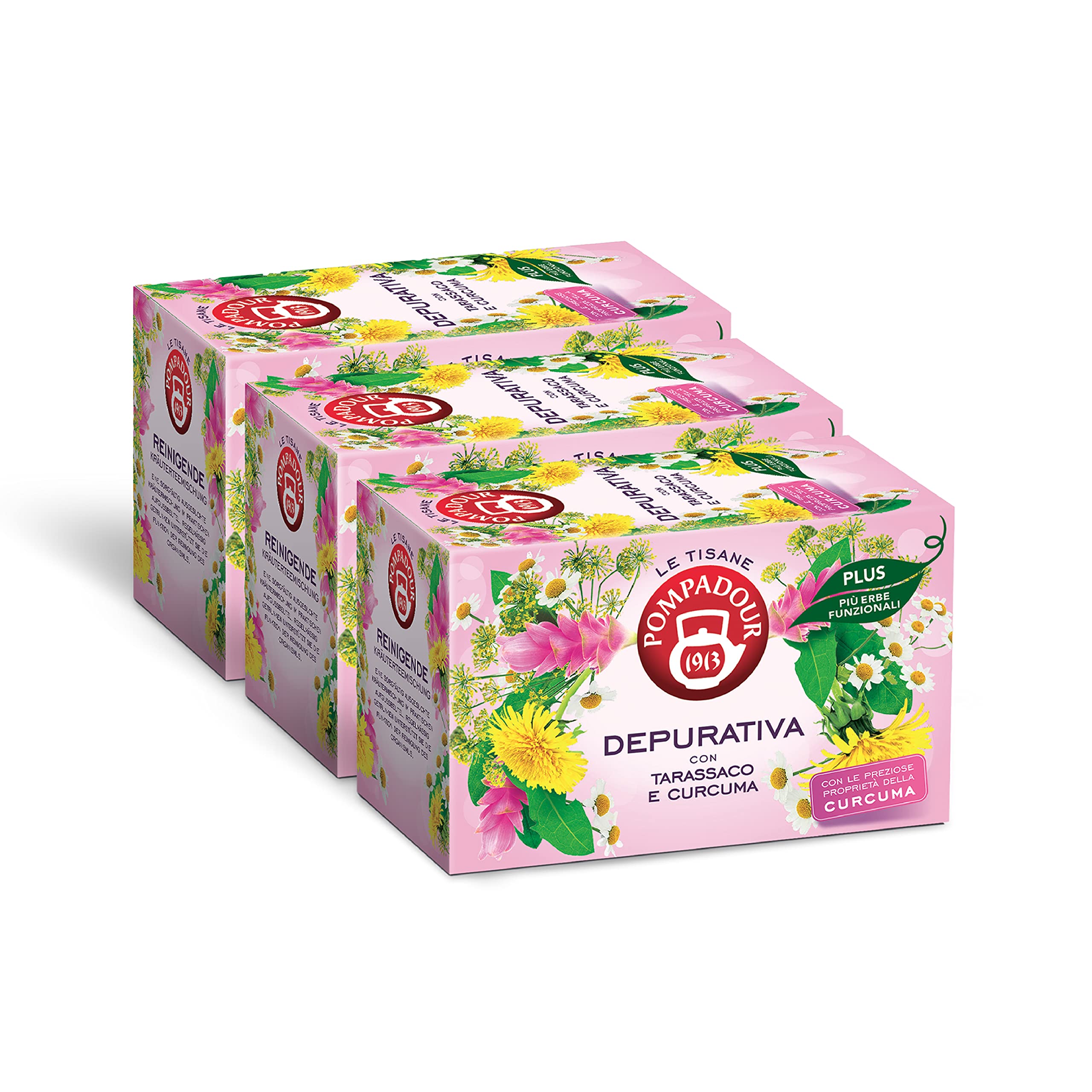 Pompadour, Tisane purifiée plus avec pissenlit et curcuma, 54 filtres (3 paquets de 18 filtres), propriétés drainantes et purifiantes, sans lactose, gluten et allergènes, végétalien TISANA DEPUURATIVE PLUS Single