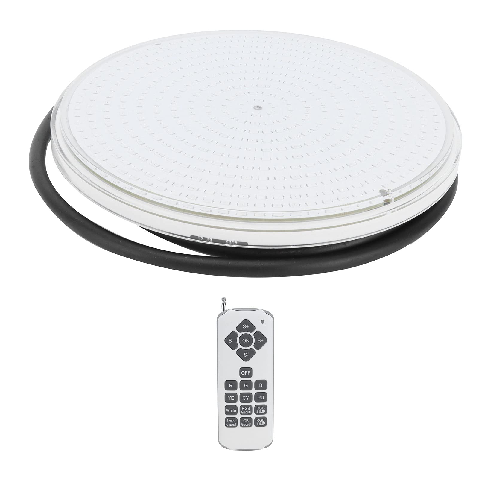 Specification: Item Type: Swimming Pool Light Material: ABS Color: As shown in the picture Product Size: Approx. 17.5x17.5x2.5cm 6.9x6.9x1.0in Weight: Approx. 880g 31oz Voltage: 12V Light Source: RGB Lamp Bead Model: SMD2835 Number of Lamp Beads: 468 Luminous Flux: 3500LM LED Life: 50000h Waterproof Rating: IP68 Application: Hotel swimming pool aquarium pool lighting, etc. How to Use: 1. Open the lampshade of the pool lamp lampshade. 2. Put the pool lamp into the lampshade and connect the power supply. 3. Install the lampshade. 4. Use the remote control to control, (the remote control needs to use 23A batteries, the battery is not included). Package List: 1 x Swimming Pool Light 1 x Remote Control(Battery Not Included) 1 x Product Instruction Manual 1 x Remote Control Instruction Manual 6 x Installation Buckle 6 x Buckle Screw 1 x Waterproof Connector Note: 1. Please allow 12in error due to manual measurement. Thanks for your understanding. 2. Monitors are not calibrated same, item color displayed in photos may be showing slightly different from the real object. Please take the real one as standard. 3. Before repairing the underwater light, the power supply connecting the underwater light and the circuit breaker must be cut off.The 18key remote control can easily control and adjust the pool light mode, and the color mode of the pool bulb can also be changed by switching the power supply. Welcome to consult. 7 static modes, 5 dynamic modes, including 7color gradient, RGB gradient, RGB jumping and other color changes and color jumping modes, and the brightness of the light source can be adjusted. The maximum safety voltage, 12V low voltage output, can ensure the safety of underwater lighting. (Not including transformer). Outstanding waterproof performance, full encapsulation waterproof, waterproof connection port waterproof, body immersion waterproof. Easy to replace, compatible with PAR56 housing, ideal for replacing halogen lamps. Improve your living environment.