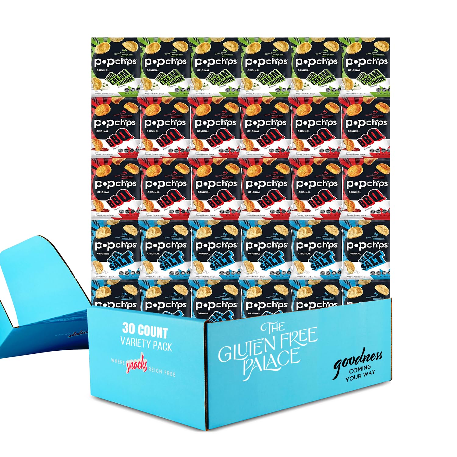 Pop Chips Variety Pack 30 Pack Snack Box 12 BBQ 12 Sea Salt and 6 Sour Cream Potato Chips Bags 0.8 Ounce Bags Gluten-Free Crackers Low-Calorie Healthy Snacks Fun Time Popchips Bulk Gift Ready Packaging