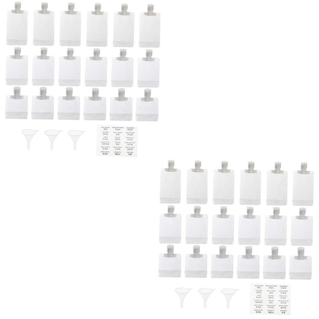 Package List 12 x Empty Squeeze Pouches(50ml) 12 x Empty Squeeze Pouches(100ml) 12 x Empty Squeeze Pouches(30ml) 2 Sheets x Labels 6 x Funnels Features -Size:8.00X8.00X2.00cm/3.14X3.14X0 travel cosmetic bag. -Size:13.00X9.00X2.50cm/5.11X3.54X0 lotion pouches. -Material:PET, PA, PE toiletry bag for travel -Color:As Shown travel size toiletries containers -Capacity: 30ml, 50ml, 100ml travel size lotion pouch -Size:11.00X8.00X2.50cm/4.32X3.14X0 shampoo travel bag. - Reasonable design, not easy to leak, you can use these travel pouches for toiletries liquid rest assured travel squeeze pouch. - These travel size squeeze pouches are made of , not easy to tear, reusable and durable for long time using travel pouches for toiletries. - Refillable cosmetic packaging bags can be used to store hand soap, shampoo, body lotion, shower gel, and cream, satisfy your different needs fluid packing bags. - Practical liquid pouch come with proper capacity for you, simple and elegant, suitable for outdoor travel using shampoo travel container. - Light weight and portable design, these refillable squeeze pouches are very convenient for you to pack, save much space portable fluid packing bags. Goods Description double ended dreadlocks These travel size lotion pouches are made of , durable, leak-proof, and can be used for long time.portable travel toiletry bag Distribute the right amount of lotion to reduce waste, good for family and outdoor travel use.traveling makeup bag Different sizes, for you to store shampoo, lotion, shower gel, and more, fit your demandsFlat travel bottles for toiletries: refillable cosmetic packaging bags can be used to store hand soap, shampoo, body lotion, shower gel, and cream, satisfy your different needs. Squeeze pouches refillable: these travel size squeeze pouches are made of , not easy to tear, reusable and durable for long time using. Makeup bag for travel: proper for who need to go on business trip or travel frequently, these shampoo travel containers are easy to refill, save much space. Travel containers: light weight and portable design, these refillable squeeze pouches are very convenient for you to pack, save much space. Portable fluid travel packing bags: practical liquid pouch come with proper capacity for you, simple and elegant, suitable for outdoor travel using.
