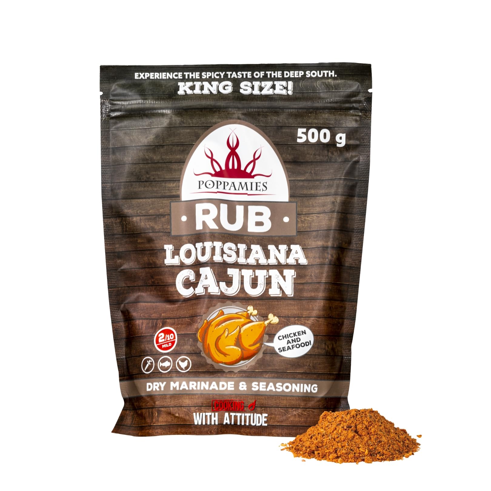 ? IN THE SAUCEPAN - Add to soups, stews, and sauces for extra flavor. ? IN THE PAN - Drizzle over steak or other cuts of meat, fry in oil, and add cream for a delicious sauce. ? IN THE OVEN - Spread a thick layer on meat, moisten with apple juice, and cook over low heat. Roast seasoned vegetables too! ? ON THE GRILL - Rub the spice blend onto meat or seafood with a little oil and grill until cooked through. ? HEAT LEVEL - 2 10. GLUTEN-FREE, LACTOSE-FREE, VEGAN. ? CULINARY FLEXIBILITY - The spice blend also works well as a dipping powder mix 2 teaspoons with cream cheese and let it chill in the refrigerator. ? MULTIPLE COOKING METHODS - Ideal for grilling, baking, pan-frying, and seasoning soups or stews. ? EASY APPLICATION - Rub in generously 40-50g of seasoning per kilogram of meat for best results. Ideal for dry rubs and general seasoning. ? BALANCED INGREDIENTS - Formulated with a perfect balance of flavors, salt, and spices, with no added additives. ? AUTHENTIC CAJUN FLAVOR - Perfect for adding a bold, spicy kick to chicken, seafood, and more.? À LA CASSEROLE - Ajoutez aux soupes, ragoûts et sauces pour plus de saveur. ? À LA POÊLE - Tapotez sur du steak ou des morceaux de viande, faites frire avec de l'huile et ajoutez de la crème pour une sauce délicieuse. ? AU FOUR - Appliquez une couche épaisse sur la viande, humidifiez-la avec du jus de pomme et faites cuire à feu doux. Rôtissez également des légumes assaisonnés !. ? AU GRIL - Frottez le mélange d'épices sur la viande ou les fruits de mer avec un peu d'huile et faites griller jusqu'à ce que ce soit cuit. ? NIVEAU DE PIQUANT - 2 10. SANS GLUTEN, SANS LACTOSE, VÉGÉTALIEN. ? FLEXIBILITÉ CULINAIRE - Le mélange d'épices fonctionne également bien comme poudre à tremper, mélangez 2 cuillères à café avec du fromage à la crème et laissez-le reposer au réfrigérateur. ? MULTIPLES MÉTHODES DE CUISSON - Idéal pour griller, cuire au four, frire à la poêle et assaisonner les soupes ou ragoûts. ? APPLICATION FACILE - Frottez généreusement 40-50g d'assaisonnement par kilogramme de viande pour de meilleurs résultats. Idéal pour la marinade sèche et l'assaisonnement général. ? INGRÉDIENTS ÉQUILIBRÉS - Conçu avec un équilibre parfait de saveurs, de sel et d'épices, sans additifs supplémentaires. ? SAVEUR CAJUN AUTHENTIQUE - Parfait pour ajouter une touche épicée et audacieuse au poulet, aux fruits de mer et plus encore.Poppamies Louisiana Cajun BBQ Rub - Assaisonnement BBQ 100 Naturel - Marinade Sèche Épices - Idéal pour le gril - Grand format (500g)