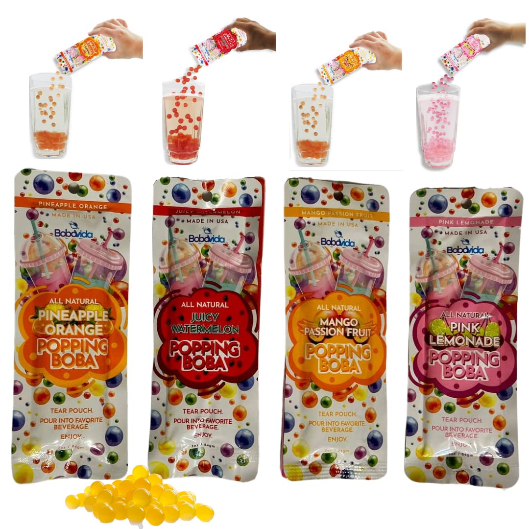 Quick, Single-Serve Cups – Great as a tasty snack or added in with milk, ice cream, or dessert. Popping Boba Pearls are made WITHOUT any preservatives or corn syrup. Made in the USA. FLAVORS: One (1) Packet of each - Mango Passion Fruit, Pineapple Orange, Pink Lemonade, Watermelon.