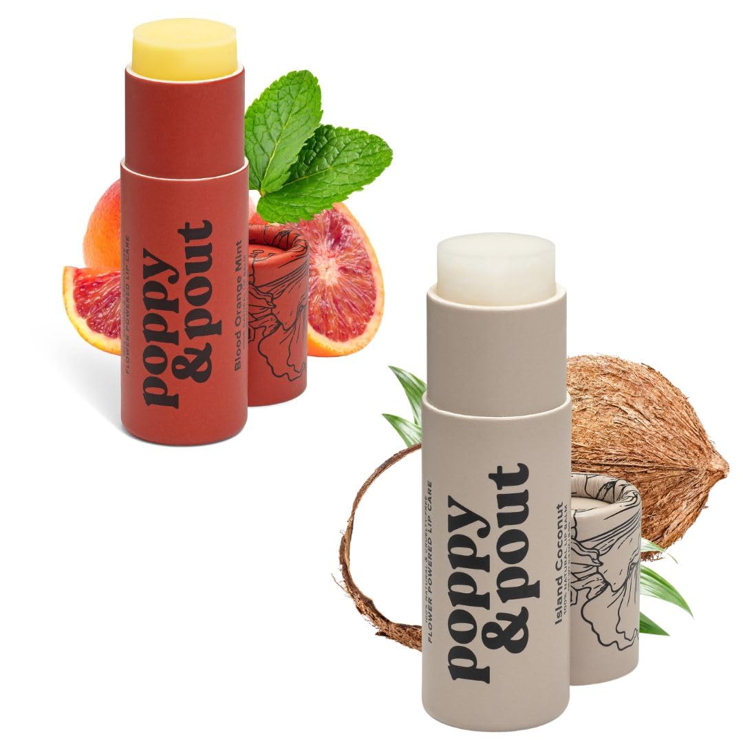 Get in touch with your inner flower child with our vintage-inspired lip balms. They are hand-poured into beautifully designed, recyclable cardboard tubes. Making a natural lip balm doesn't stop with our packaging, all our ingredients are derived from nature. They are made with beeswax, sunflower oil, organic coconut oil, and just a hint of vanilla. We even throw in some vitamin E for extra nourishment. It takes a little extra care to fill paperboard tubes. Our lip balms are hand-poured at our Poppy Pout headquarters in Idaho. Love care goes into making each lip balm. We provide good-paying jobs in our local community it's our way of giving back. Our lip balm tubes are 0.3oz which is nearly twice the size of a standard lip balm tube. Natural Ingredients, Coconut Oil, Beeswax, Sunflower Oil, Grapefruit Oil, Sweet Orange Oil, Vanilla Planifolia Extract, Vitamin E.Made in the USA: Poppy Pout is an independent small business, taking pride in our humble beginnings. We work closely within our community and make all of our lip balms in-house! You can rest easy when you use Poppy Pout lip care products. Lip Moisturizer: Our rich and smooth lip balm formula helps soothe dry, cracked lips. Our natural lip balms provide long-lasting moisture, leaving behind soft lips and hydration that provides a protective barrier against harsh environmental conditions, and can help to prevent chapping, dryness, and peeling. Natural Ingredients, Cruelty Free, Leaping Bunny Certified: Our flavored lip balm uses clean natural ingredients organic coconut oil, USA-sourced beeswax, and natural flavor oils. Our smooth lip balm formula is a natural lip moisturizer that locks in hydration. Free of parabens, phthalates, petrolatum, and sodium lauryl sulfate. Jumbo Lip Balm: Double the product with none of the plastic! This beeswax lip balm comes in a sustainable and recyclable cardboard lip balm tube that contains more than double the product compared to a standard 0.15 oz plastic tube. Island Coconut Lip Balm: Our Island Coconut Jumbo Lip Balm will take you straight to the beach with a breezy, tropical scent and all the hydration your lips need for a day in the sunshine. Poppy and Pout lip balms are clean and cruelty-free with lasting hydration.