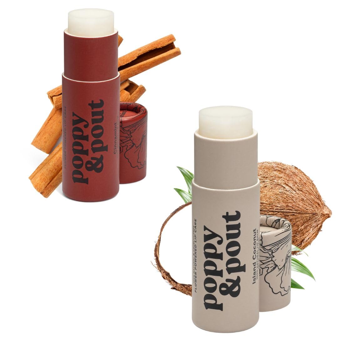 Made in the USA: Poppy Pout is an independent small business, taking pride in our humble beginnings. We work closely within our community and make all of our lip balms in-house! You can rest easy when you use Poppy Pout lip care products. Lip Moisturizer: Our rich and smooth lip balm formula helps soothe dry, cracked lips. Our natural lip balms provide long-lasting moisture, leaving behind soft lips and hydration that provides a protective barrier against harsh environmental conditions, and can help to prevent chapping, dryness, and peeling. Natural Ingredients, Cruelty Free, Leaping Bunny Certified: Our flavored lip balm uses clean natural ingredients organic coconut oil, USA-sourced beeswax, and natural flavor oils. Our smooth lip balm formula is a natural lip moisturizer that locks in hydration. Free of parabens, phthalates, petrolatum, and sodium lauryl sulfate. Jumbo Lip Balm: Double the product with none of the plastic! This beeswax lip balm comes in a sustainable and recyclable cardboard lip balm tube that contains more than double the product compared to a standard 0.15 oz plastic tube. Island Coconut Lip Balm: Our Island Coconut Jumbo Lip Balm will take you straight to the beach with a breezy, tropical scent and all the hydration your lips need for a day in the sunshine. Poppy and Pout lip balms are clean and cruelty-free with lasting hydration.