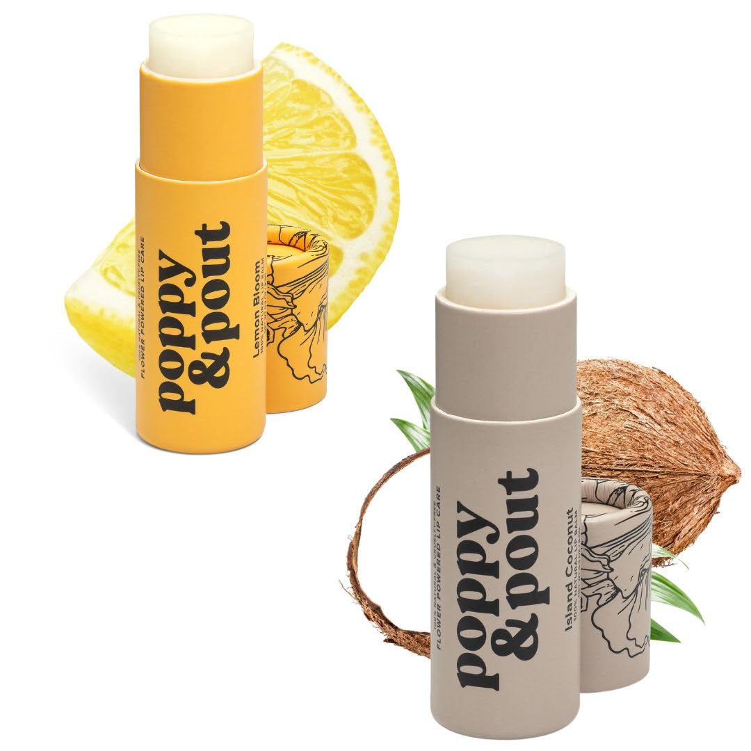 Poppy & Pout Jumbo Lip Balm 2 Pack All Natural Lip Balms & Moisturizers Hydrates with Beeswax Vitamin E Organic Coconut Island Coconut & Lemon Bloom