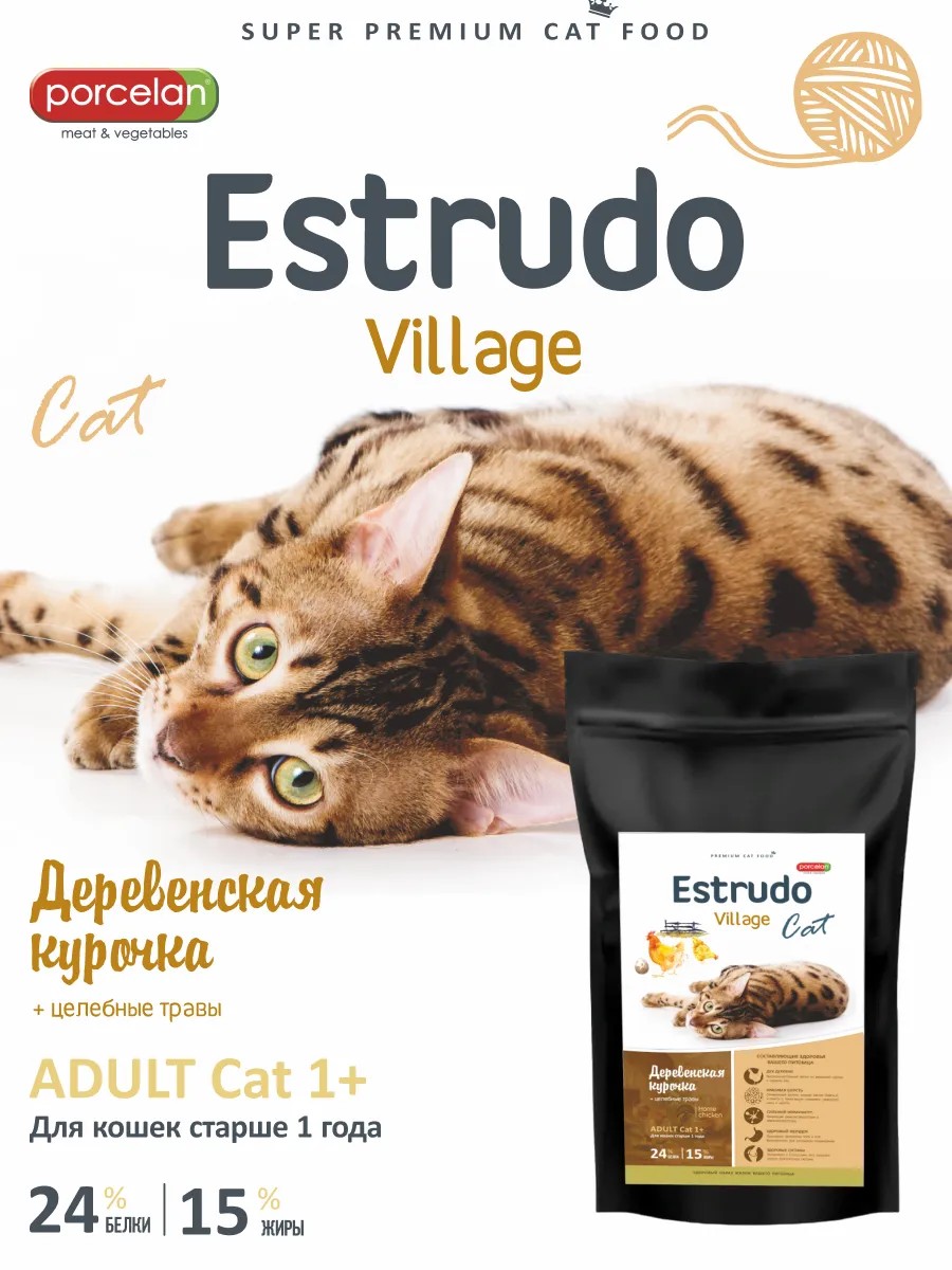 Полнорационное сбалансированное питание для взрослых кошек корм Estrudo Village (Домашняя курочка) изготовлен из ароматного мяса домашней курочки и пропитан запахом и вкусом деревенской жизни.