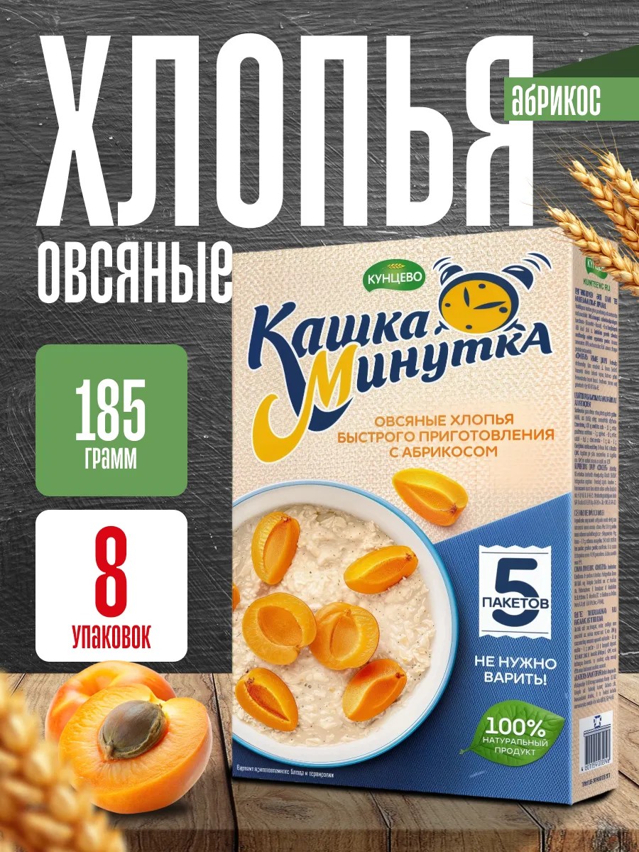 Kashka-Minutka with apricot flavor contains a blend of oat, wheat, rye, barley, and buckwheat flakes.