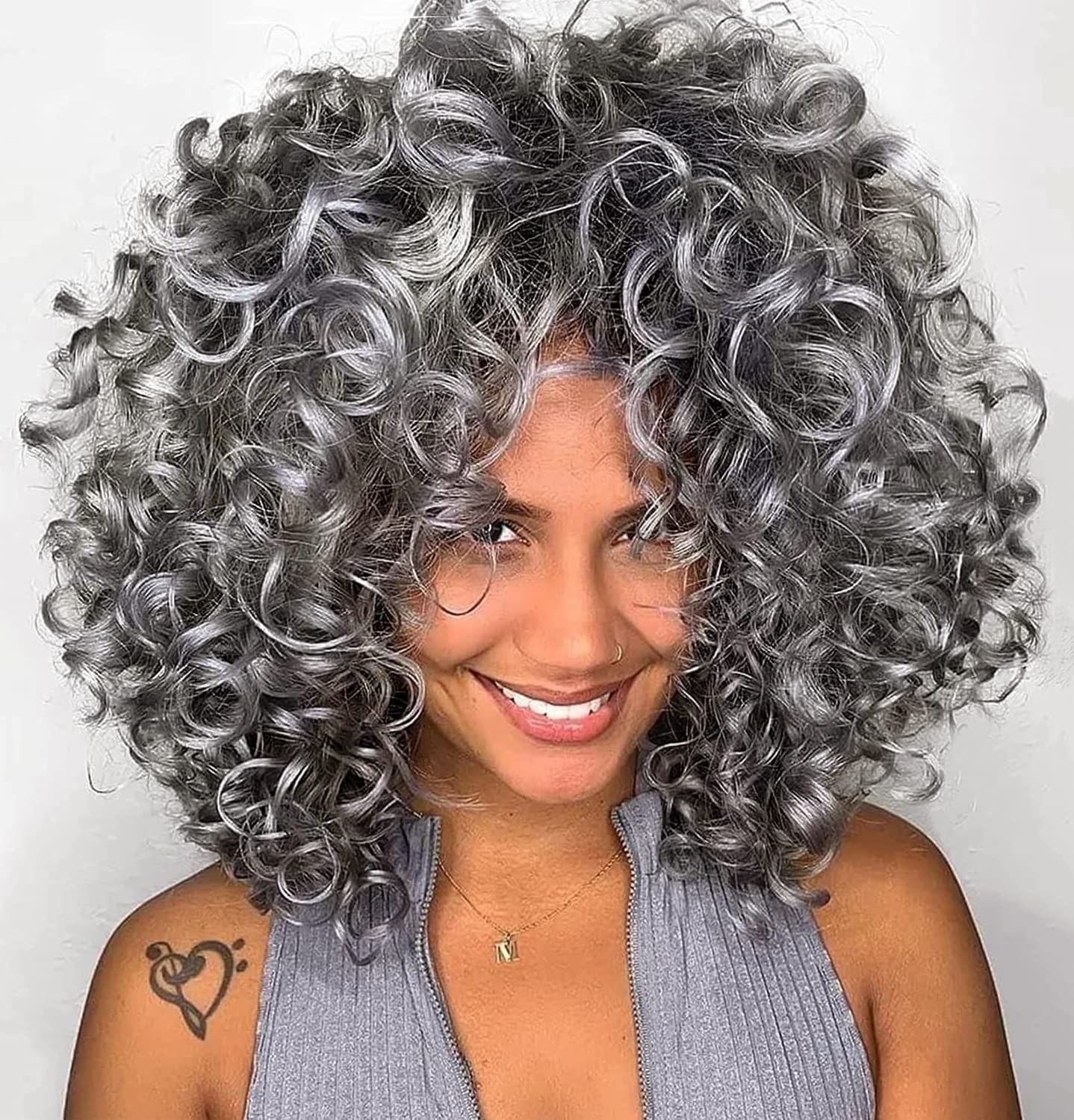 Porsmeer afro wig gray ladies ombre silver gray synthetic confusing loose curly natural hair for women kinky curly with pony short wigs for everyday useful cosplay black with silver highlights