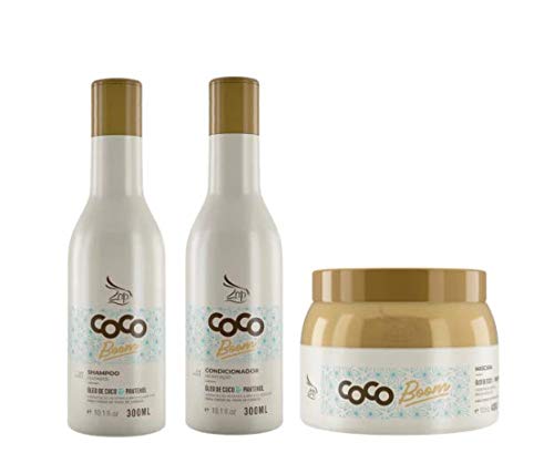 Coco Boom Shampoo has been carefully developed to promote gentle cleansing, removing accumulated residue that leaves hair dull, heavy, and lifeless. Thanks to the combination of coconut oil and panthenol, it prepares hair for nourishing and repairing treatments. It restores vitality, lightness, and shine to the hair. How to use: Apply Coco Boom Shampoo to wet hair and massage with your fingertips until a lather forms. Rinse thoroughly. Repeat if necessary. Coco Boom Conditioner has been specially developed for chemically treated hair. It restores damaged hair thanks to the combination of coconut oil and panthenol, leaving it healthy and nourished. How to use: With hair already cleansed with Coco Boom Shampoo and still damp, apply a sufficient amount of Coco Boom Conditioner, gently massaging it into the strands. Leave on for a few minutes, rinse thoroughly, and style as desired. The Coco Boom mask was developed to deeply nourish hair, while also providing emollience, manageability, and softness. It repairs and nourishes hair thanks to the combination of coconut oil and panthenol, keeping treated hair healthy for longer. How to use: After using Coco Boom Washb Shampoo, apply a sufficient amount of Coco Boom Mask and gently massage it into the hair. Leave on for 5 to 10 minutes. Rinse. Style as desired.Brazilian straightening treatment based on coconut.ZAP COCO BOOM KIT DE MAINTENANCE Gamme COMPLET 300ML (3 kits)DESCRIPTION DU PRODUIT Le shampoing Coco Boom a été soigneusement développé pour favoriser un nettoyage en douceur, en éliminant les résidus accumulés qui laissent les cheveux opaques, lourds et sans vie, grâce à l'association d'huile de Coco Panthenol, prépare les cheveux à l'application de procédures nutritionnelles et réparatrices. Redonne vitalité, légèreté et brillance aux cheveux. Comment utiliser: appliquez le shampooing Coco Boom sur les cheveux mouillés et massez du bout des doigts jusqu'à obtention de la mousse, rincez abondamment. Répétez la procédure si nécessaire. Le revitalisant Coco Boom a été spécialement développé pour les cheveux traités chimiquement, en restaurant les cheveux abîmés, grâce à l'association d'huile de coco et de panthénol, les laissant sains et nourris. Comment utiliser: Avec les cheveux déjà nettoyés par le shampooing Coco Bom et encore humides, appliquez une quantité suffisante de revitalisant lavant Coco Boom, en massant doucement les mèches. Laisser agir quelques minutes, rincer abondamment et terminer comme vous le souhaitez. Le masque Coco Boom a été développé pour nourrir en profondeur les cheveux, en plus d'apporter émollience, facilité et douceur. Répare et nourrit les fils grâce à l'association de l'huile de coco et du panthénol, en gardant les fils traités plus longtemps. Comment utiliser: Après avoir utilisé le Coco Boom Shampoo Washb, appliquez une quantité suffisante de Coco Boom Masque, massez en collant doucement les mèches. Laissez agir pendant 5 à 10 minutes. Rincer. Terminez comme vous le souhaitez.Lissage Brésilien à base de Coco.
