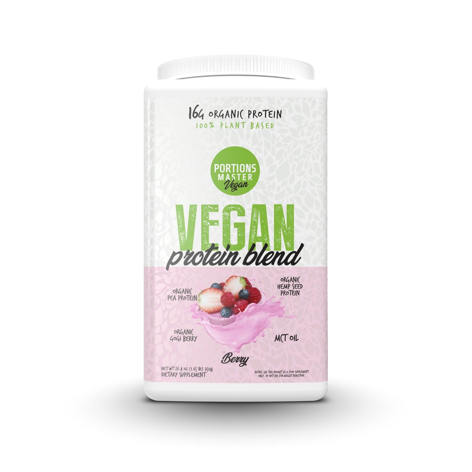 Portions Master Vegan Protein Blend, Complete Plant Based Protein Powder with Pea Hemp Seed Goji Blend Medium Chain Triglycerides (750g, Berry) Berry 1.65 Pound (Pack of 1)