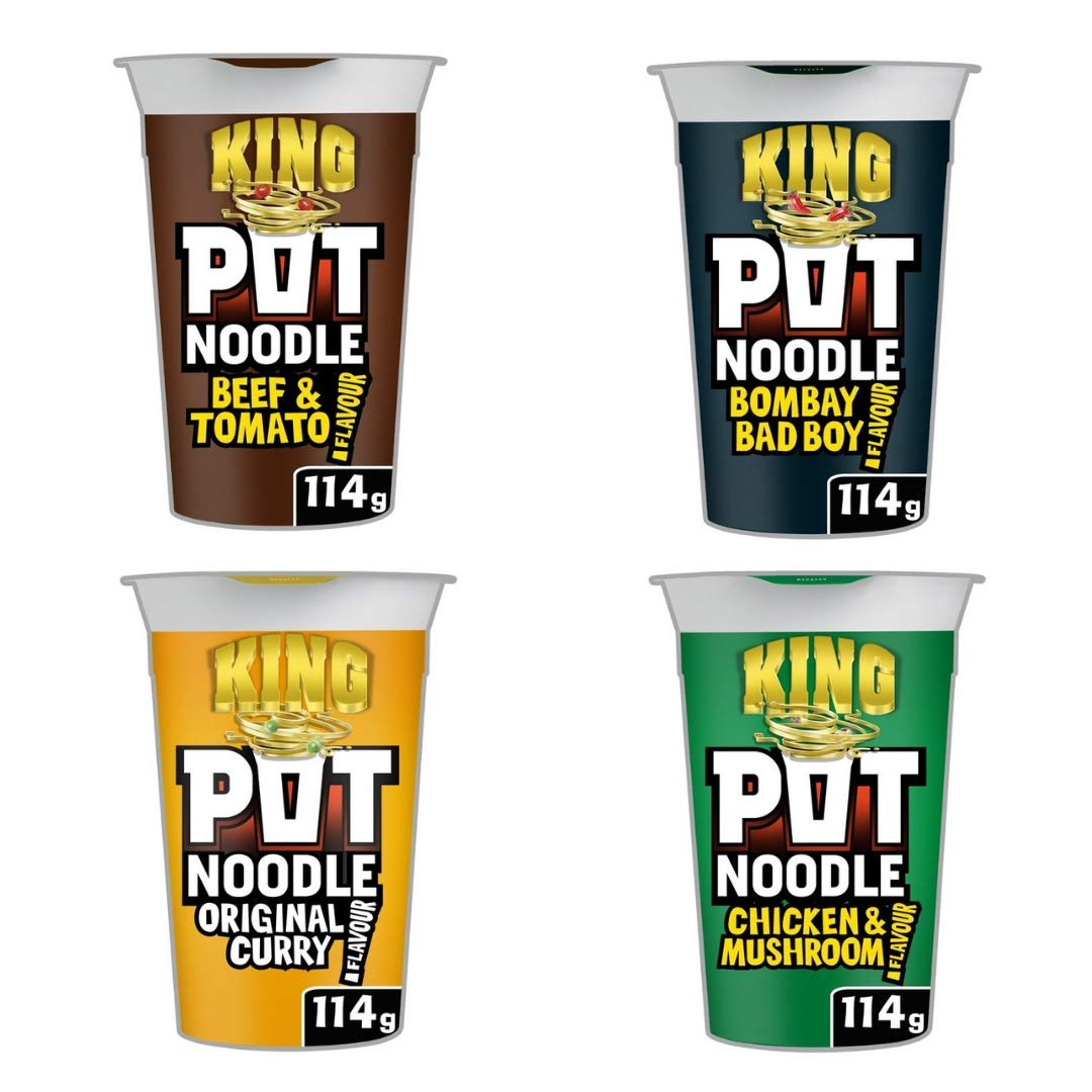 Pot Noodle Pot Noodle King Bundle | Chicken & Mushroom Pot 114g | Bombay Bad Boy 114g | Original Curry 114g | Beef & Tomato 114g | Total of 4 x 114g noodles