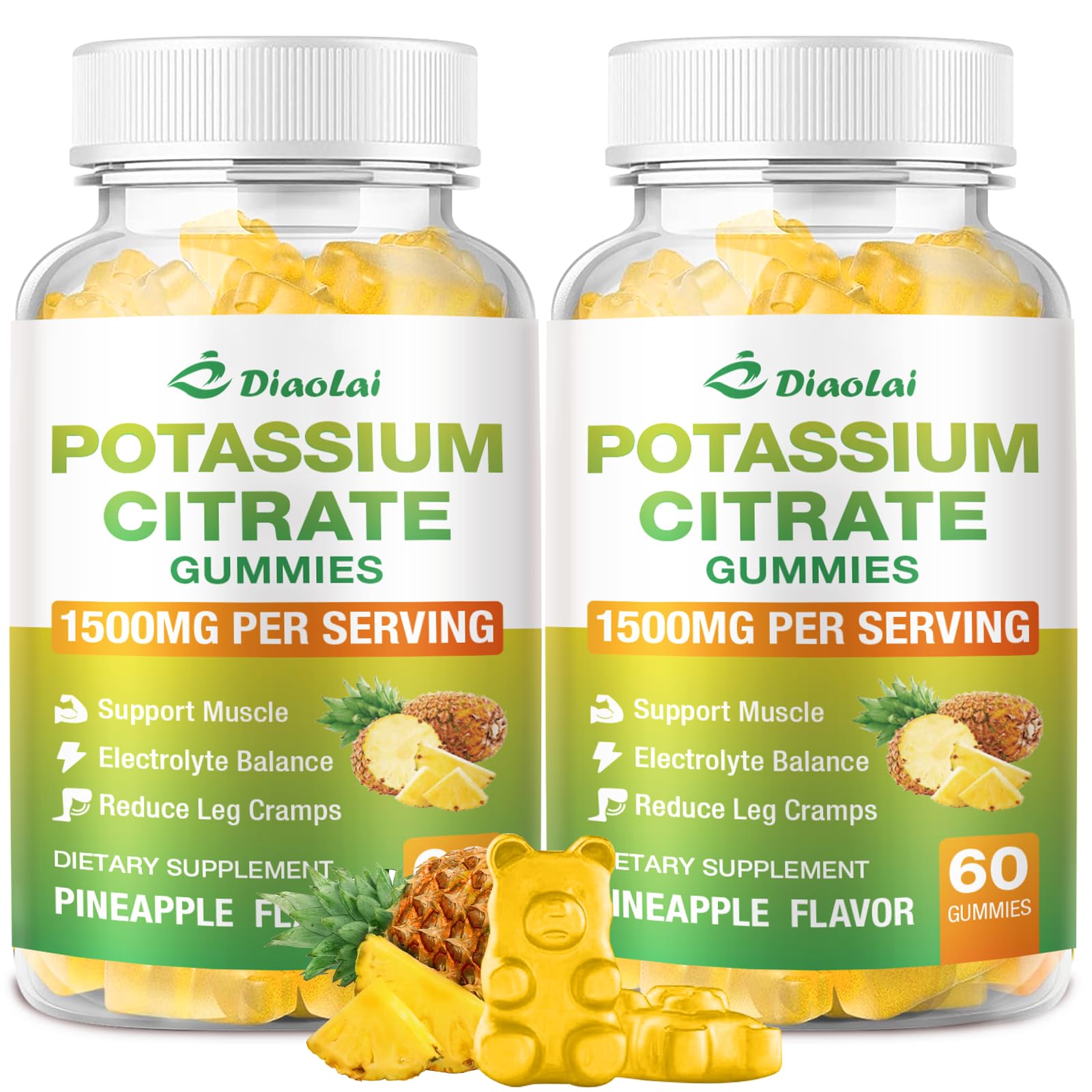 Convenient 120-Count Bottle – Perfect for on-the-go use, whether at work, the gym, or traveling. These gummies are made from premium ingredients and manufactured in a GMP-certified facility. Fast-Absorbing Gentle on Stomach – Unlike traditional potassium tablets, these gummies are easy to digest and won't cause nausea or digestive discomfort. Vegan Delicious Pineapple Flavor – Made with plant-based ingredients, free from gelatin, artificial colors, or harsh additives. Enjoy a tropical pineapple taste instead of hard-to-swallow pills. Supports Leg Muscle Health – Ideal for athletes, active adults, or anyone experiencing muscle cramps, stiffness, or fatigue due to low potassium levels. 1500mg Potassium Citrate per Serving – Each gummy delivers a potent dose of potassium to help replenish electrolytes, support proper muscle function, and maintain healthy hydration levels.