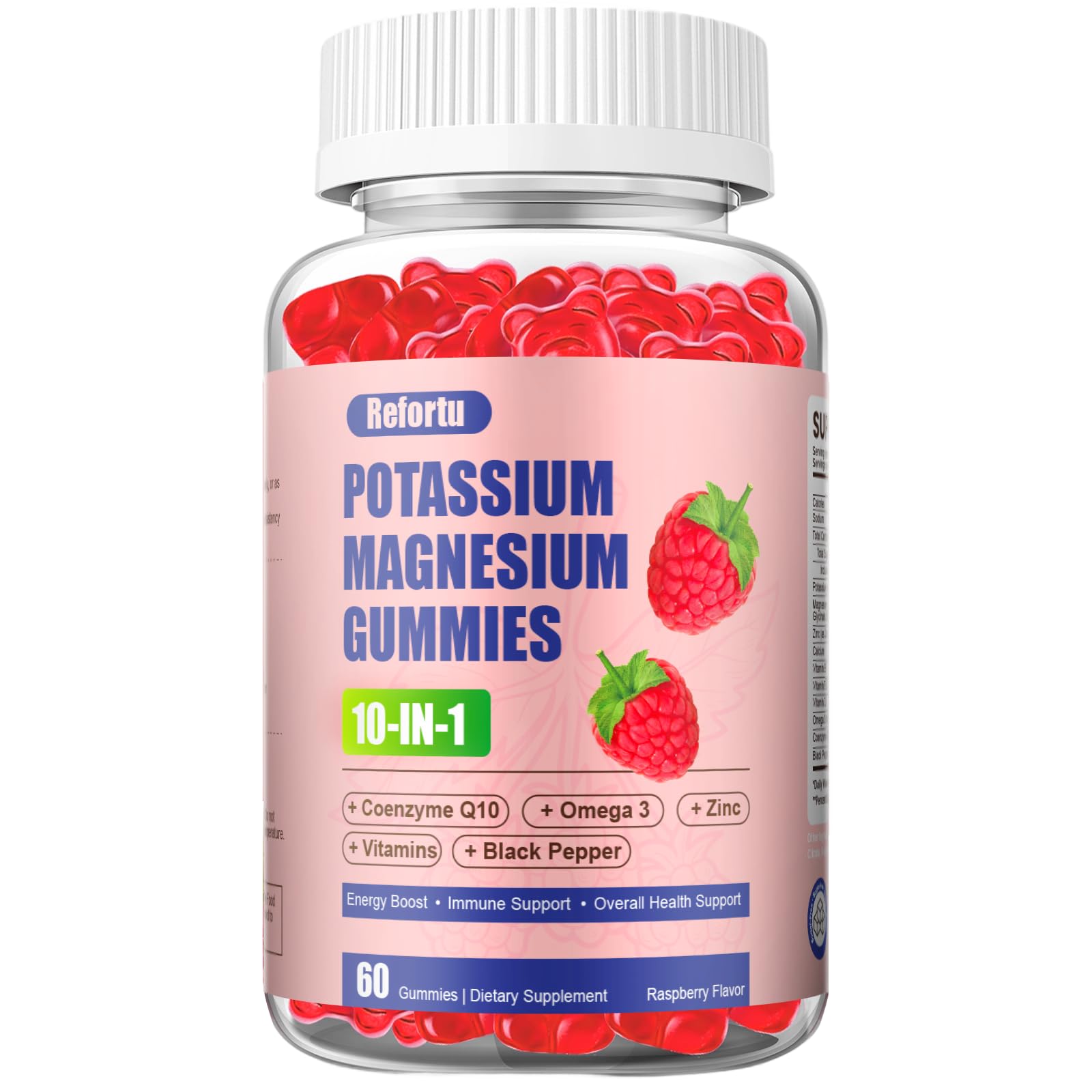 All-Natural Ingredients: This potassium magnesium gummy adheres to a sugar-free formula. All ingredients are extracted from fresh natural plants, with plant pectin replacing gelatin to retain the natural sweetness of raspberries. Strict quality control standards are followed throughout the production process, ensuring no sucrose, gluten, or artificial colors are added. Easy to Take: Just 2 chewable potassium magnesium gummies a day, and one bottle provides a one-month supply. No more hassle with swallowing capsules or tablets – it effortlessly supplements potassium, magnesium and various nutrients, helping you reach your health goals. Gentle and Highly Absorbable: This potassium magnesium supplement mild raw materials and an easily absorbable formula, which not only avoids irritation to the body but also achieves optimal nutrient absorption. Multiple Health Benefits: As essential minerals for the human body, potassium and magnesium work synergistically. They not only help boost physical vitality but also provide comprehensive support for overall human health. Compound Formula: Potassium magnesium gummies contain magnesium glycinate, potassium gluconate, calcium, zinc, and Coenzyme Q10, along with added vitamins B6, B12, D3, Omega 3, and black pepper. They facilitate full absorption of nutrients, comprehensively supply minerals and vitamins, and meet diverse daily nutritional needs.