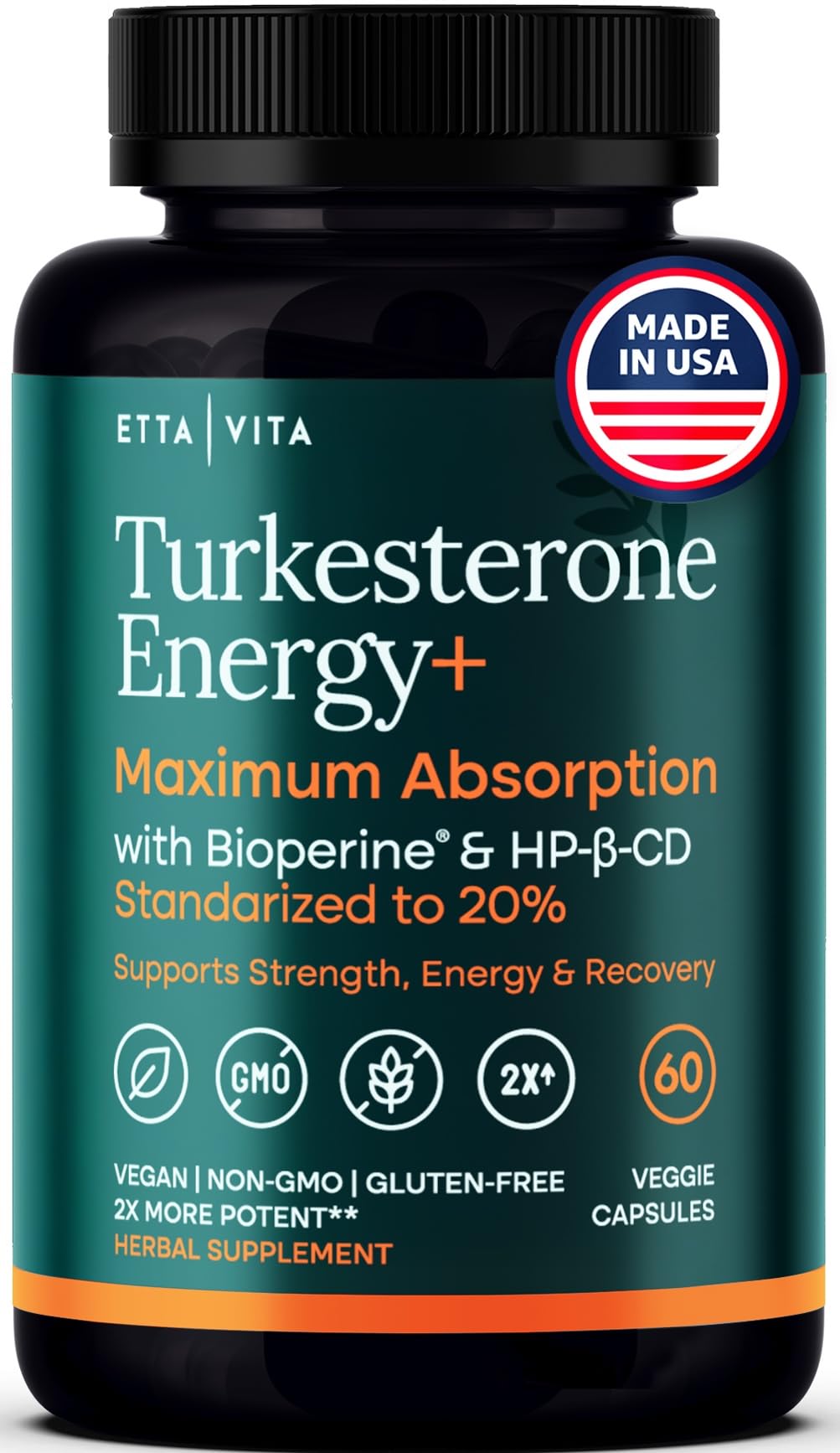[Made Tested in the USA] This turkesterone herbal supplement is tested in the USA for potency and purity. Our medicinal product is then made in an FDA, and GMP-registered facility held to the highest standards. [20 Standardized Extract - 2x More Pure Than Standard Formula] Etta Vita has refined the extraction process of the raw material, making it twice as potent as common testosterone booster for men and women with the same intake. [Improved Muscle Recovery] This Hydroxypropyl-Beta-Cyclodextrin complex in our turkesterone supplement promotes muscle repair and health, making our product an exceptional choice for Athletic performance and physical drive. We offer Turkesterone 500mg extract per capsule that is studied to support healthy recovery from the brutal gym workout and daily activity. [Plant-based Blend for Healthy T Levels] Turkesterone, or ajuga turkestanica, is a shrub and natural herbal testosterone supplement for men and women, completely vegan, that supports healthy test levels and works as a muscle accelerator for men. [Max Potency with 2x Absorbency] Etta Vita has refined the extraction process of the raw material, making it twice as potent as common turkesterone capsules with the same intake. Enjoy our turkesterone supplement with the combo of BioPerine and Black Pepper Extract that can 2x the absorbency of the supplement as they deter the digestive enzyme from diminishing its delivery. [90 Day Promise] We stand behind our commitment to our customers and will support any inquiries in the first 3 months of trying this product. Made in the USA!.