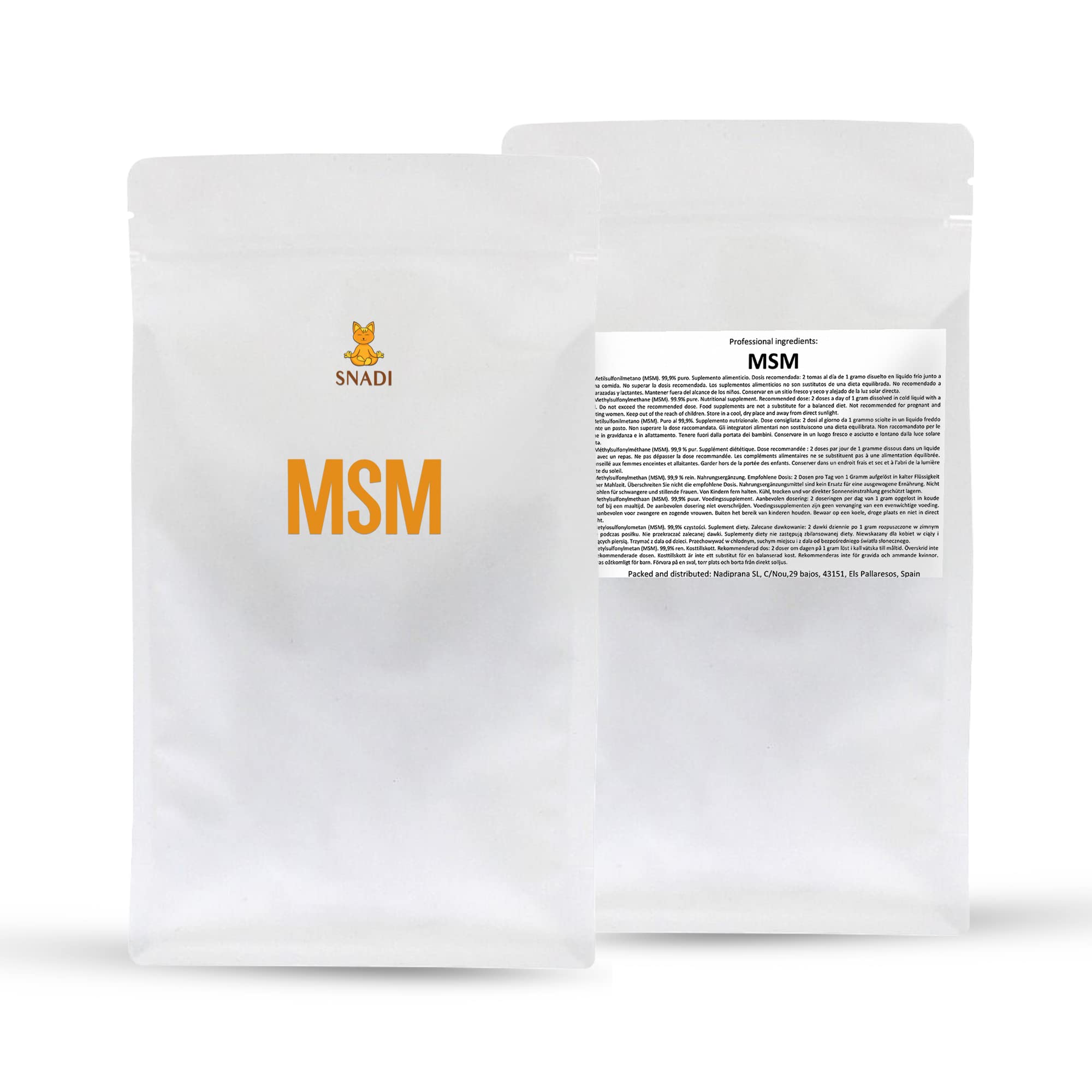 : Discover the power of organic sulfur with Snadi's Pure MSM Powder. This high-quality, vegan product contains methylsulfonylmethane (MSM), an organic sulfur compound naturally found in our bodies and which can be used to supplement our diet. MSM plays a crucial role in cartilage health, contributing to joint mobility and stability, as well as muscle function and recovery. It is also essential for the formation of skin, nails, and hair, making it an excellent ally for your personal care. This 99.9 pure MSM powder is 100 vegan and additive-free, containing no magnesium stearate, flavorings, colorings, stabilizers, lactose, gluten, preservatives, or GMOs. With a recommended dose of 2 teaspoons (2g) per day, you can easily and effectively enjoy its benefits. Furthermore, its fine-grained structure dissolves easily in cold water and offers high bioabsorption, making it easy to consume. It comes in a convenient 1 kg bag with a reusable airtight seal, guaranteeing freshness. Snadi is a brand committed to quality and the health of its customers, carefully selecting and packaging all its products in Spain. With Pure MSM Powder, Snadi offers you a high-quality product at an affordable price, so you can take care of your health without compromising your budget. Due to its composition, this product is ideal for people following a vegan diet or looking for nutritional supplements without additives or GMOs. Incorporate Snadi's Pure MSM Powder into your daily routine and discover the benefits of organic sulfur for your overall well-being. Ingredients: MSM - MethylsulfonylmethaneExcellent Value for Money With our MSM powder, you get a high-quality product at an affordable price. Plus, it comes in a convenient reusable zip-lock bag. Vegan and Additive-Free Our MSM powder is 100 vegan and contains no magnesium stearate, flavorings, colorings, stabilizers, lactose, gluten, preservatives, or GMOs. A pure and natural product to complement your diet. Easy to Use Thanks to its fine grain structure, our MSM powder dissolves easily in cold water. With a recommended dose of 2 teaspoons per day, this 1 kg bag will last you a long time. Enhance your well-being Our MSM powder helps improve joint mobility and stability, in addition to contributing to proper muscle function and recovery. It is also essential for the formation of healthy skin, nails, and hair. Pure and Natural Enjoy the benefits of organic sulfur with our MSM powder. With a purity of 99.9 , this product is an excellent addition to your daily diet. Ideal for those seeking a healthy, vegan lifestyle.Description du produit Découvrez la puissance du soufre organique avec le MSM Pur en poudre de Snadi. Ce produit végan de haute qualité contient du méthylsulfonylméthane (MSM), un composé de soufre organique naturellement présent dans notre corps et pouvant être utilisé pour compléter notre régime alimentaire. Le MSM joue un rôle crucial dans la santé de nos cartilages, contribuant à la mobilité et à la stabilité articulaires, ainsi qu'à la fonction et à la récupération musculaire. De plus, il est essentiel pour la formation de la peau, des ongles et des cheveux, ce qui en fait un excellent allié pour vos soins personnels. Cette poudre de MSM, d'une pureté de 99,9 , est 100 végane et sans additifs, exempte de stéarate de magnésium, d'arômes, de colorants, de stabilisants, de lactose, de gluten, de conservateurs et d'OGM. Avec une dose recommandée de 2 cuillères à café (2g) par jour, vous pouvez profiter de ses avantages facilement et efficacement. En outre, sa structure à grain fin se dissout facilement dans l'eau froide et offre une haute bio-absorption, facilitant ainsi sa consommation. Elle est présentée dans un sac pratique de 1 kg avec une fermeture hermétique réutilisable, garantissant sa fraîcheur. Snadi est une marque engagée dans la qualité et la santé de ses clients, sélectionnant et emballant soigneusement tous ses produits en Espagne. Avec le MSM Pur en poudre, Snadi vous offre un produit de haute qualité à un prix abordable, afin que vous puissiez prendre soin de votre santé sans compromettre votre budget. De par sa composition, ce produit est idéal pour les personnes suivant un régime végan ou recherchant des suppléments nutritionnels sans additifs ni OGM. Intégrez le MSM Pur en poudre de Snadi à votre routine quotidienne et découvrez les bienfaits du soufre organique pour votre bien-être général. Ingrédients MSM - MetilsulfonilmetaneExcellent Rapport Qualité-Prix-Durée Avec notre poudre de MSM, vous obtenez un produit de haute qualité à un prix abordable. De plus, il est fourni dans un sac pratique réutilisable avec fermeture éclair. Végan et Sans Additifs Notre poudre de MSM est 100 végane et ne contient pas de stéarate de magnésium, d'arômes, de colorants, de stabilisants, de lactose, de gluten, de conservateurs ou d'OGM. Un produit pur et naturel pour compléter votre alimentation. Facile à Utiliser Grâce à sa structure à grain fin, notre poudre de MSM se dissout facilement dans l'eau froide. Avec une dose recommandée de 2 cuillères à café par jour, ce sac de 1 KG vous durera longtemps. Améliorez votre bien-être Notre poudre de MSM aide à améliorer la mobilité et la stabilité articulaire, en plus de contribuer au bon fonctionnement et à la récupération musculaire. Elle est également essentielle à la formation de la peau, des ongles et des cheveux. Pur et Naturel Profitez des bienfaits du soufre organique avec notre poudre de MSM. Avec une pureté de 99,9 , ce produit est un excellent complément à votre alimentation quotidienne. Idéal pour ceux qui recherchent un mode de vie sain et végan.Poudre de MSM Pure 1 KG Méthylsulfonylméthane à 99,9 de Pureté Végan et Sans Additifs Haute Bio-absorption Pour la Peau, les Ongles et les Cheveux, Sans Couleur, Taille 1 KG