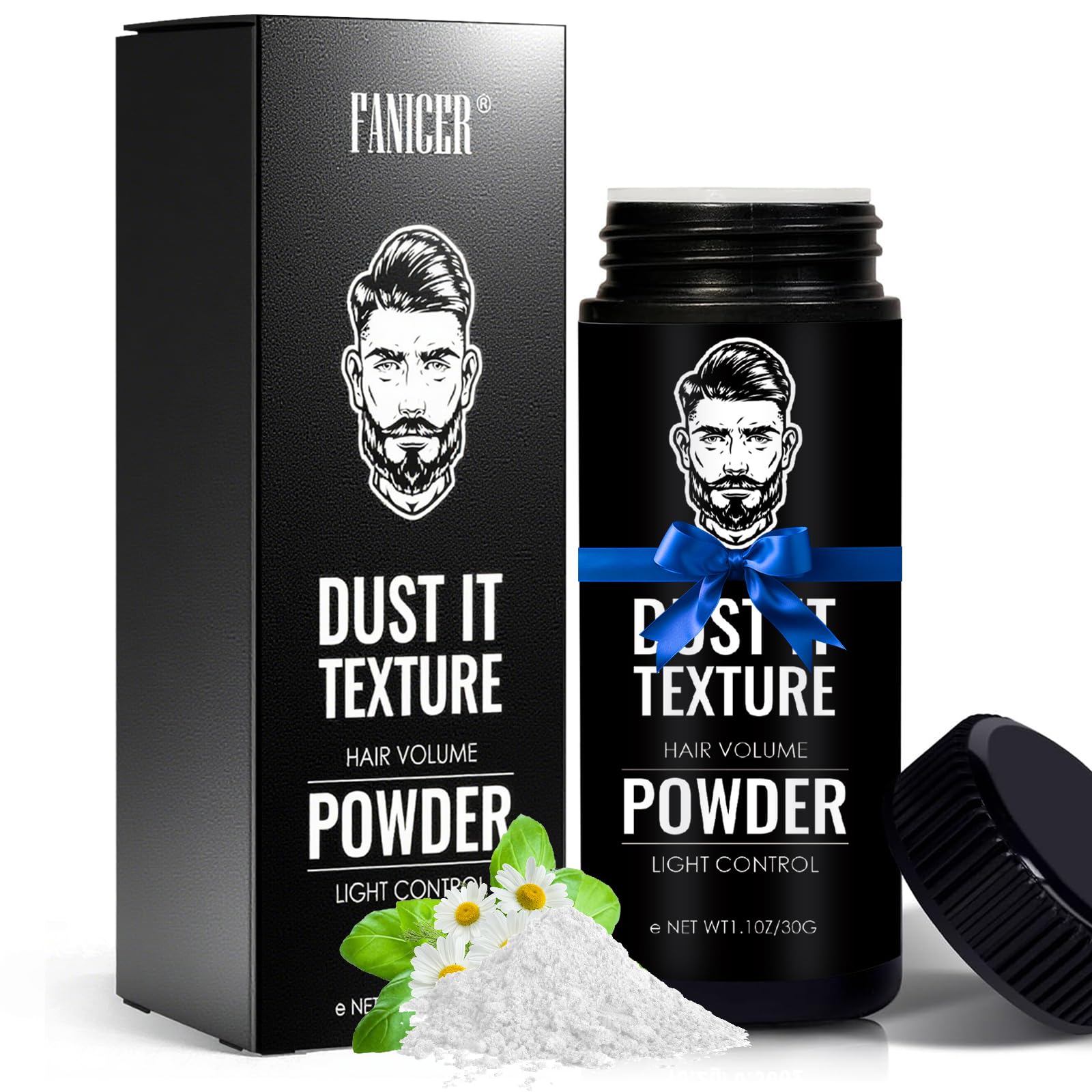 Contenantnoirdepoudrecoiffanteavecletexte«DustItTexturePowder».Lesimagesavantetaprèsmontrentuneaugmentationduvolumedescheveuxchezleshommesetlesfemmes.