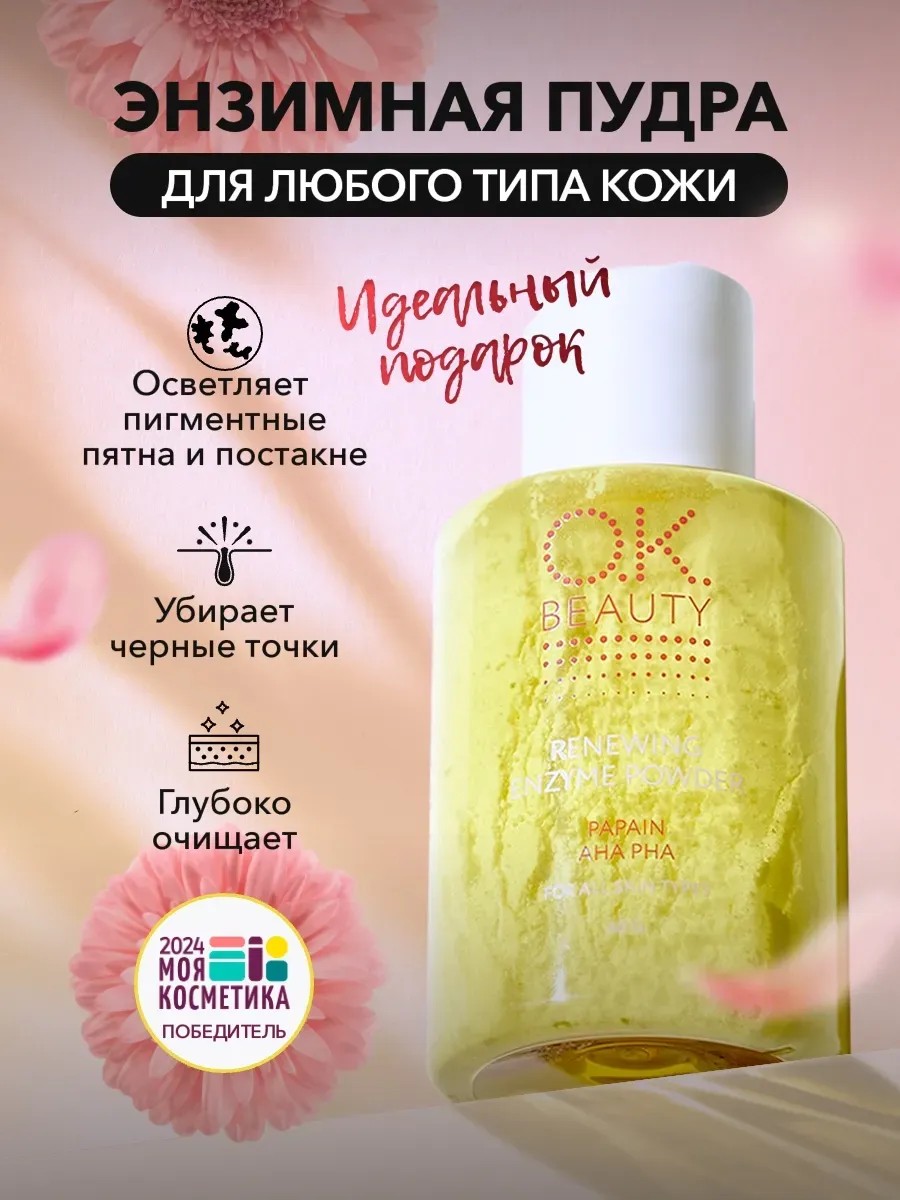 Энзимная пудра OK BEAUTY (Окей Бьюти) — это деликатный пилинг и уходовая косметика от прыщей, которая обеспечит уход за лицом и телом. Обеспечивает мягкое, но интенсивное очищение, выравнивает микрорельеф кожи и способствует клеточному обновлению. При контакте с водой умывалка для лица превращается в мягкую пену, которая обеспечивает глубокое очищение кожи, удаляет загрязнения и остатки макияжа. Рассыпчатая пудра для лица также работает как средство от черных точек на носу, от постакне и акне, а также обладает увлажняющими свойствами. Энзимная пудра прекрасно подходит для ухода за проблемной, жирной и сухой кожей лица - ее можно использовать как как пилинг скатку против любых несовершенств. Азелаиновая кислота в составе дает антибактериальный эффект, подходит даже для кожи с розацеа. Миндальная кислота – улучшает цвет лица и микрорельеф кожи, позволяет устранить черные точки, стимулирует синтез коллагена и эластина. Декатное очищение подходит даже для кожи подростка. Как уход за телом пудра помогает избавиться от вросших волос, помогает от раздражения кожи и воспаления после эпиляции. Результат: Энзимы папайи отшелушивают ороговевшие клетки и выравнивают тон. Аминокислоты в составе успокаивают и смягчают грубую кожу. Не травмирует естественный защитный барьер кожи. Wow-эффект после первого применения. Чистая обновлённая кожа без жирного блеска и чёрных точек, ровный матовый тон и здоровое сияние. Энзимная очищающая пудра Ок Бьюти - это борьба с несовершенствами и домашний профессиональный уход! Энзимная пудра не заменит собой гель для умывания, мицеллярную воду и гидрофильное масло, но прекрасно дополнит уход. Идеальный подарок на 14 февраля, 8 Марта, день рождения, Новый год любимой девушке, женщине, жене, коллеге, начальнице, дочери, маме, бабушке, сестре, подруге, тёте, свекрови, тёще! Подарите себе домашний спа уход! Используйте энзимную пудру не более 1-3 раз в неделю.
