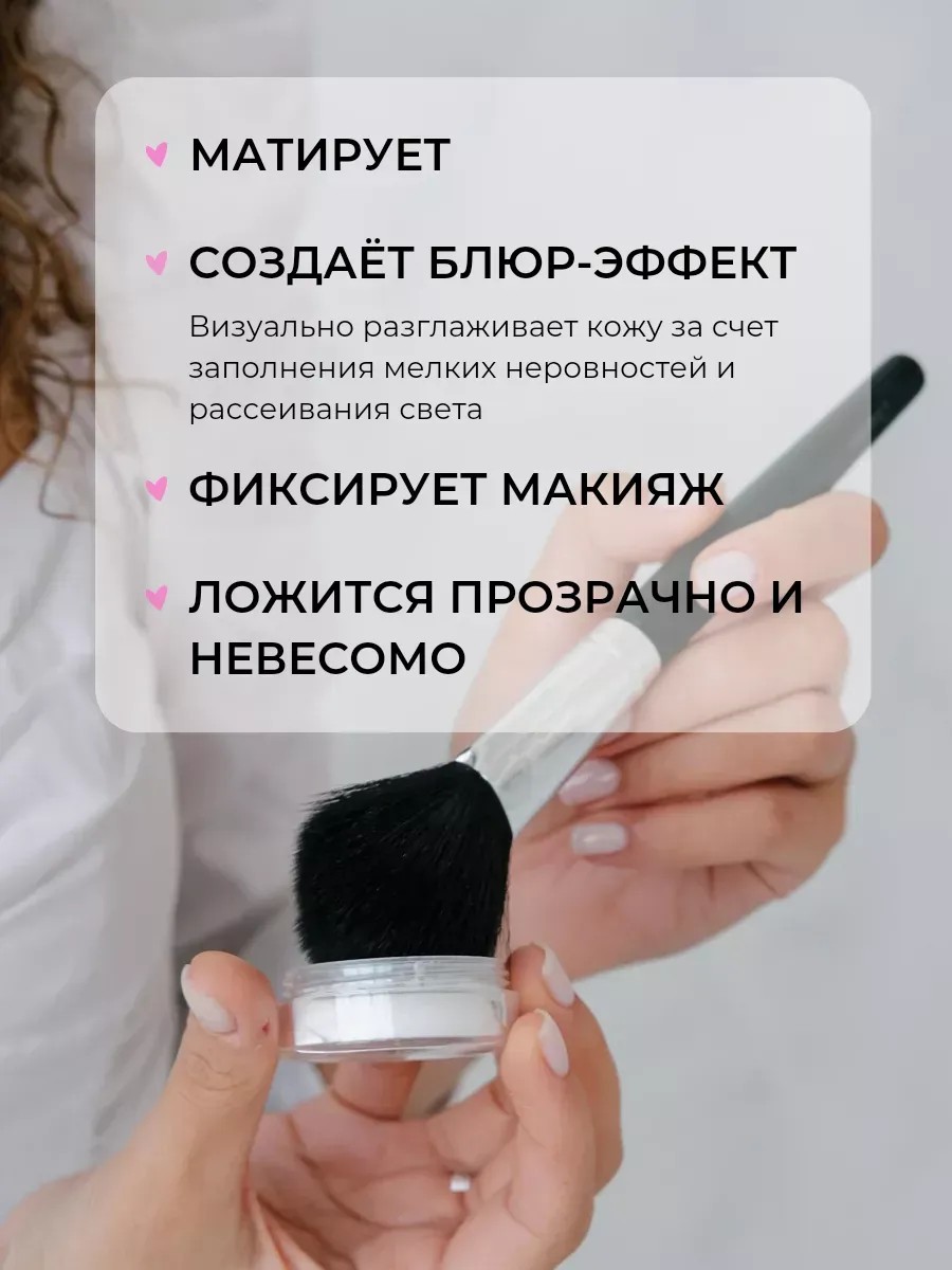 Минеральная прозрачная матирующая пудра для лица Smooth выравнивает и разглаживает микро рельеф кожи, расширенные поры и морщинки. Помогает от жирного блеска. Ложится тонким и невидимым слоем. Микросферы, входящие в состав, рассеивают свет в разных направлениях. Это создаёт фотошоп - блюр. Второе название - HD эффект. 4 способа использования. Праймер. Тональная основа, нанесённая поверх, легче растушёвывается и дольше держится. Финишная - фиксирующая. Закрепляет макияж как фиксатор, делает стойким и матовым. Самостоятельный продукт. Если хочется снизить жирность, наложите поверх крема. На веки. Это обезжирит их, тени будут держаться дольше. Для всех типов кожи. Особенно хорошо подходит для жирной и комбинированной, чувствительной. При использовании на сухом типе, увлажните её и используйте только в качестве завершающего средства. Рассыпчатая пудра упакована в баночку с закрывающимся сифтером - дозатором, чтобы отсыпать нужное количество для дневного или вечернего макияжа. Декоративная косметика сделана в России. Белая, но ложится бесцветно. Универсальный транспарентный оттенок, подходящий всем цветотипам. Натуральная, гипоалергенная, без талька и крахмала