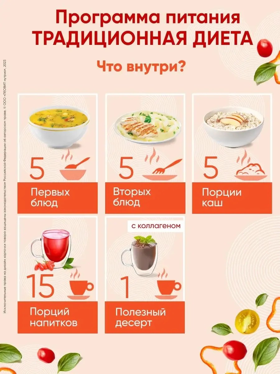 | Package Contents | Soup 5 pcs; Porridge 4 pcs; Ready-Made Main Courses 5 pcs; Weight Loss Drinks 15 pcs |