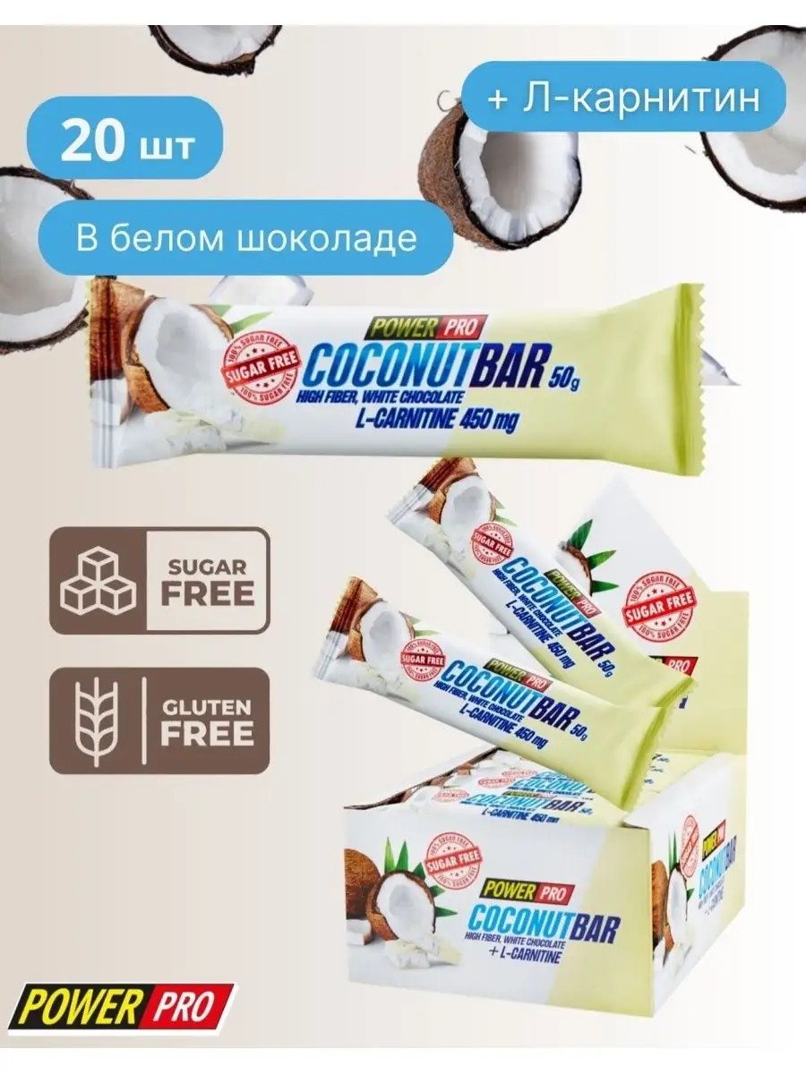 The idea that healthy eating can't be tasty is long outdated. Now you can indulge in sweets without worrying about the negative effects of sugar, palm oil, and harsh flavors, as POWER PRO bars are made with natural ingredients and are health-conscious. Coconut bars, like white chocolate, are considered very high in calories, and those watching their weight consider them off-limits. Therefore, POWER PRO specialists were among the first to create coconut bars in white chocolate that are sugar- and gluten-free. This reduced the calorie content and, in addition to the beloved flavor, added beneficial properties to these healthy bars. They are now a dietary product that can be included in a weight-loss plan. All our healthy bars have a high fiber content, which acts as a prebiotic and promotes improved digestion. Plus, every sugar-free COCONUT BAR in white chocolate contains added L-carnitine—try this healthy snack from POWER PRO.