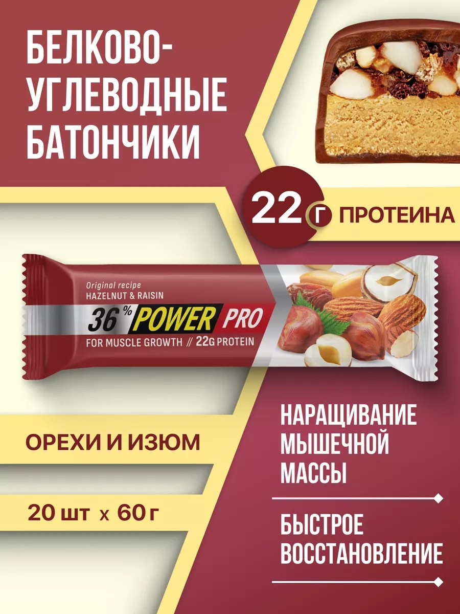 Протеиновый батончик для набора массы с 36% белка от POWER PRO поможет быстро, удобно и вкусно набрать необходимые калории и компенсировать недостаток белка. Уникальная многослойная структура, включающая хрустящий верхний слой - миндаль, фундук, арахис и кранчи, слой протеиновой нуги и покрытие из тонкого слоя молочного шоколада. Мы использовали белки с разной скоростью усвоения: сывороточный белок и казеин. Сывороточный белок быстро подавляет распад мышечных волокон, ускоряет анаболизм, в то время как казеин надолго обеспечивает чувство сытости и высокий уровень аминокислот в крови. Также мы добавляем в спортивное питание пищевые волокна (пребиотики), которые стимулируют развитие полезной микрофлоры и помогают организму усваивать белок. Орехи содержат полезные жирные кислоты, витамины и минералы, которые укрепляют сердечно-сосудистую и нервную системы. Протеиновые батончики имеют в составе комплекс витаминов, который укрепляет иммунитет и ускоряет обмен веществ. Прошел испытания и признан "ФИЦ питания и биотехнологий" специализированным продуктом для питания спортсменов.
