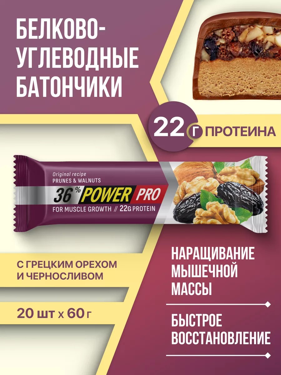 The POWER PRO protein bar for weight gain with 36% protein will help you quickly, conveniently, and deliciously get your calories and compensate for protein deficiency. Its unique multi-layer structure includes a crunchy top layer of walnuts, crunch, and dried fruit, a layer of protein nougat, and a thin coating of milk chocolate. We used proteins with different absorption rates: whey protein and casein. Whey protein quickly suppresses muscle breakdown and accelerates anabolism, while casein provides a long-lasting feeling of satiety and high amino acid levels in the blood. We also add dietary fiber (prebiotics) to the sports nutrition, which stimulates the development of beneficial microflora and helps the body absorb protein. Nuts contain healthy fatty acids, vitamins, and minerals that strengthen the cardiovascular and nervous systems. Protein bars contain a vitamin complex that strengthens the immune system and speeds up metabolism.