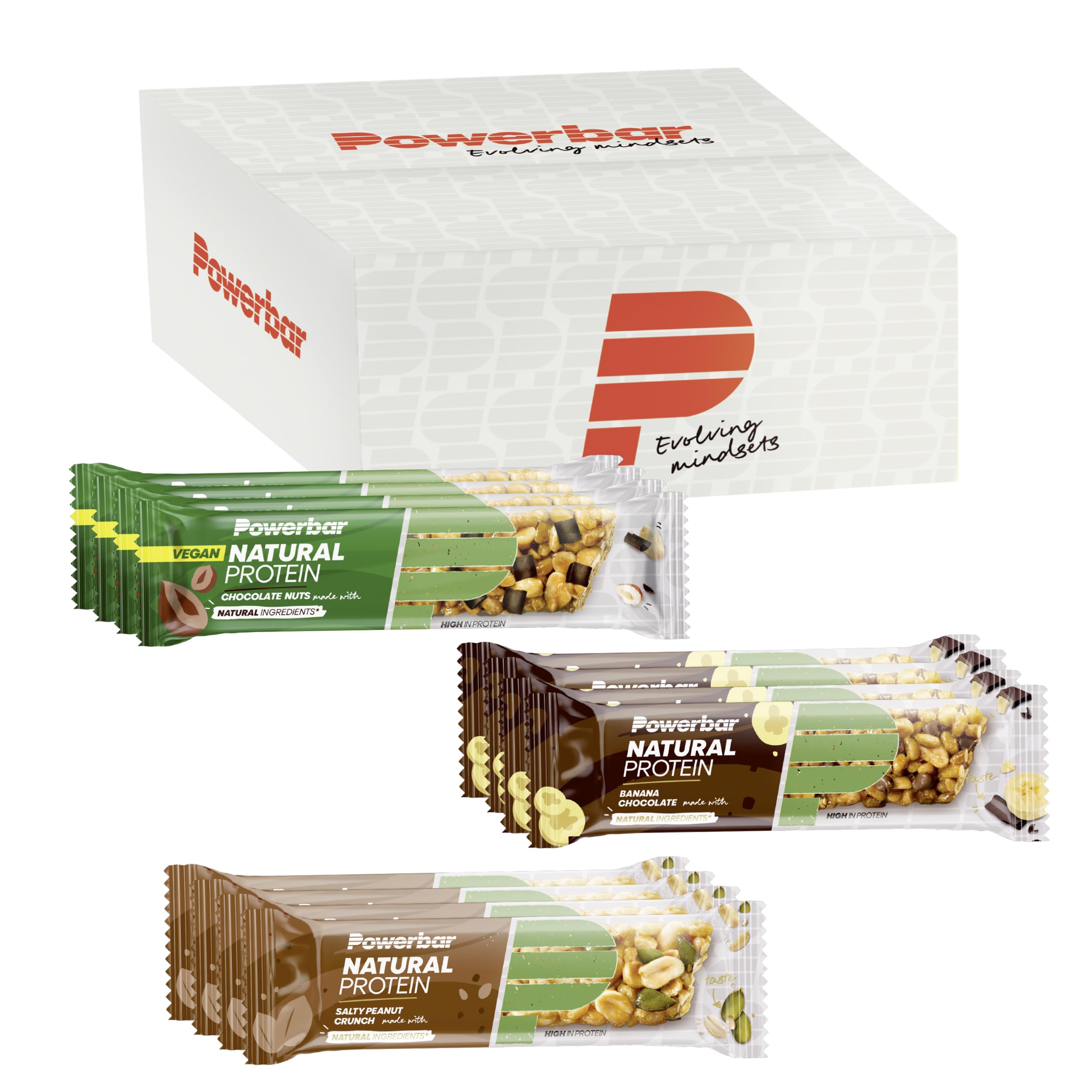 : Looking for a protein bar made with natural, vegan ingredients? If so, the delicious Natural Protein bar is the perfect companion for you. It's made with excellent natural, vegan ingredients and tastes great too. With 30 protein, it's a perfect post-workout snack, but also great throughout the day. All Powerbar products are listed in the Cologne Register, so we can offer athletes greater safety and reliability. Made with vegan ingredients, but produced on a line that also produces dairy products. Chocolate Nuts Ingredients: Roasted PEANUTS (19 ), SOY crispies (19 ) (SOY protein isolate , starch , salt), invert sugar syrup, SOY beans (10 ), maltodextrin , pea protein (6 ), coconut oil, roasted HAZELNUTS (5 ), dark chocolate pieces (5 ) [cocoa mass , sugar , fat-reduced cocoa powder , dextrose , cocoa butter , emulsifier (lecithins)], glucose syrup, fructose, humectant (glycerol), natural flavorings , salt, vanilla extract , emulsifier [lecithins (SOY)]. of natural origin. May contain: MILK, CEREALS CONTAINING GLUTEN, OTHER TREE NUTS Banana Chocolate: Soy crisps (20 ) (soy protein isolate , starch , salt), soybeans (13 ), roasted peanuts (13 ), invert sugar syrup, maltodextrin , pea protein (6 ), banana pieces (6 ) (bananas , rice flour ), coconut oil, dark chocolate pieces (5 ) [cocoa mass , sugar , fat-reduced cocoa powder , dextrose , cocoa butter , emulsifier (lecithins)], glucose syrup, fructose, humectant (glycerol), natural flavoring , salt, vanilla extract , emulsifier [lecithins (soy)]. of natural origin. May contain: milk, cereals containing gluten, tree nuts Salty Peanut Crunch: Roasted PEANUTS (22 ), SOY crispies (16 ) (SOY protein isolate , starch , salt), SOY beans (12 ), invert sugar syrup, maltodextrin , pea protein (6 ), coconut oil, glucose syrup, fructose, pumpkin seeds (4.5 ), humectant (glycerol), salt, natural flavoring , vanilla extract , emulsifier [lecithins (SOY)]. From natural origin. May contain: MILK, CEREALS CONTAINING GLUTEN, TREE NUTS.EXTRA HIGH IN PROTEIN, each Mixbox contains an attractive assortment of 4 bars per flavor. Plenty of snacks to meet all your needs. Developed in Germany, guaranteeing the proven quality of Powerbar. Packed with 30 protein, this vegan snack provides your muscles with valuable, entirely plant-based protein. Delicious natural ingredients like soy, peanuts, and almonds (depending on the variety) are featured in our low-sugar vegan protein bar. Whether fruity, savory, or sweet, the Natural Protein Bar is a convenient snack for when you're feeling peckish and a delicious reward after a workout.Description du produit Vous recherchez une barre protéinée qui contient des ingrédients naturels et végétaliens ? Si oui, la délicieuse barre Natural Protein est un compagnon idéal pour vous. Elle se compose d'excellents ingrédients naturels et végétaliens, et en plus, son goût est délicieux. Avec 30 de protéines, c'est un parfait en-cas après l'entraînement, mais également tout au long de la journée. Tous les produits Powerbar figurent dans la liste de Cologne, par conséquent, nous pouvons offrir aux athlètes plus de sécurité et de fiabilité. à base d'ingrédients végétaliens, mais produits sur une ligne produisant également des produits laitiers. Ingrédients Chocolate Nuts: ARACHIDES grillées (19 ), crispies de SOJA (19 ) (isolat de protéine de SOJA , amidon , sel), sirop de sucre inverti, graines de SOJA (10 ), maltodextrine , protéine de pois (6 ), huile de coco, NOISETTES grillées (5 ), chocolat noir en morceaux (5 ) [pâte de cacao , sucre , cacao maigre en poudre , dextrose , beurre de cacao , émulsifiant (lécithines)], sirop de glucose, fructose, humectant (glycérol), arômes naturels , sel, extrait de vanille , émulsifiant [lécithines (SOJA)]. d'origine naturelle. Peut contenir : LAIT, CÉRÉALES CONTENANT DU GLUTEN, AUTRES FRUITS À COQUE Banana Chocolate: Crispies de SOJA (20 ) (isolat de protéine de SOJA , amidon , sel), graines de SOJA (13 ), ARACHIDES grillées (13 ), sirop de sucre inverti, maltodextrine , protéine de pois (6 ), morceaux de bananes (6 ) (bananes , farine de riz ), huile de coco, chocolat noir en morceaux (5 ) [pâte de cacao , sucre , cacao maigre en poudre , dextrose , beurre de cacao , émulsifiant (lécithines)], sirop de glucose, fructose, humectant (glycérol), arôme naturel , sel, extrait de vanille , émulsifiant [lécithines (SOJA)]. d'origine naturelle. Peut contenir : LAIT, CÉRÉALES CONTENANT DU GLUTEN, FRUITS À COQUE Salty Peanut Crunch: ARACHIDES grillées (22 ), crispies de SOJA (16 ) (isolat de protéine de SOJA , amidon , sel), graines de SOJA (12 ), sirop de sucre inverti, maltodextrine , protéine de petits pois (6 ), huile de coco, sirop de glucose, fructose, graines de courge (4,5 ), humectant (glycérol), sel, arôme naturel , extrait de vanille , émulsifiant [lécithines (SOJA)]. d'origine naturelle. Peut contenir : LAIT, CÉRÉALES CONTENANT DU GLUTEN, FRUITS À COQUE.EXTRA RICHE EN PROTÉINES, chaque Mixbox contient un assortiment attractif de 4 barres par saveur. Des snacks en quantité suffisante pour répondre à tous vos besoins. DÉVELOPPÉ EN ALLEMAGNE, ce qui garantit la qualité éprouvée de Powerbar. REMPLI DE 30 DE PROTÉINES, le snack végan fournit à vos muscles des protéines précieuses d'origine entièrement végétale. DE DÉLICIEUX INGRÉDIENTS NATURELS comme le soja, les cacahuètes et les amandes (selon la variété) sont présents dans notre barre protéinée végane pauvre en sucre. QU'IL SOIT FRUITÉ, SALÉ OU SUCRÉ, le Natural Protein Bar est un snack pratique pour les petites faims et une délicieuse récompense après l'entraînement.Powerbar - Natural Protein - Multiflavour Box - 12x40g - Barres protéinées végétaliennes - Sans huile de palme - Ingrédients naturels Mix 12x40g