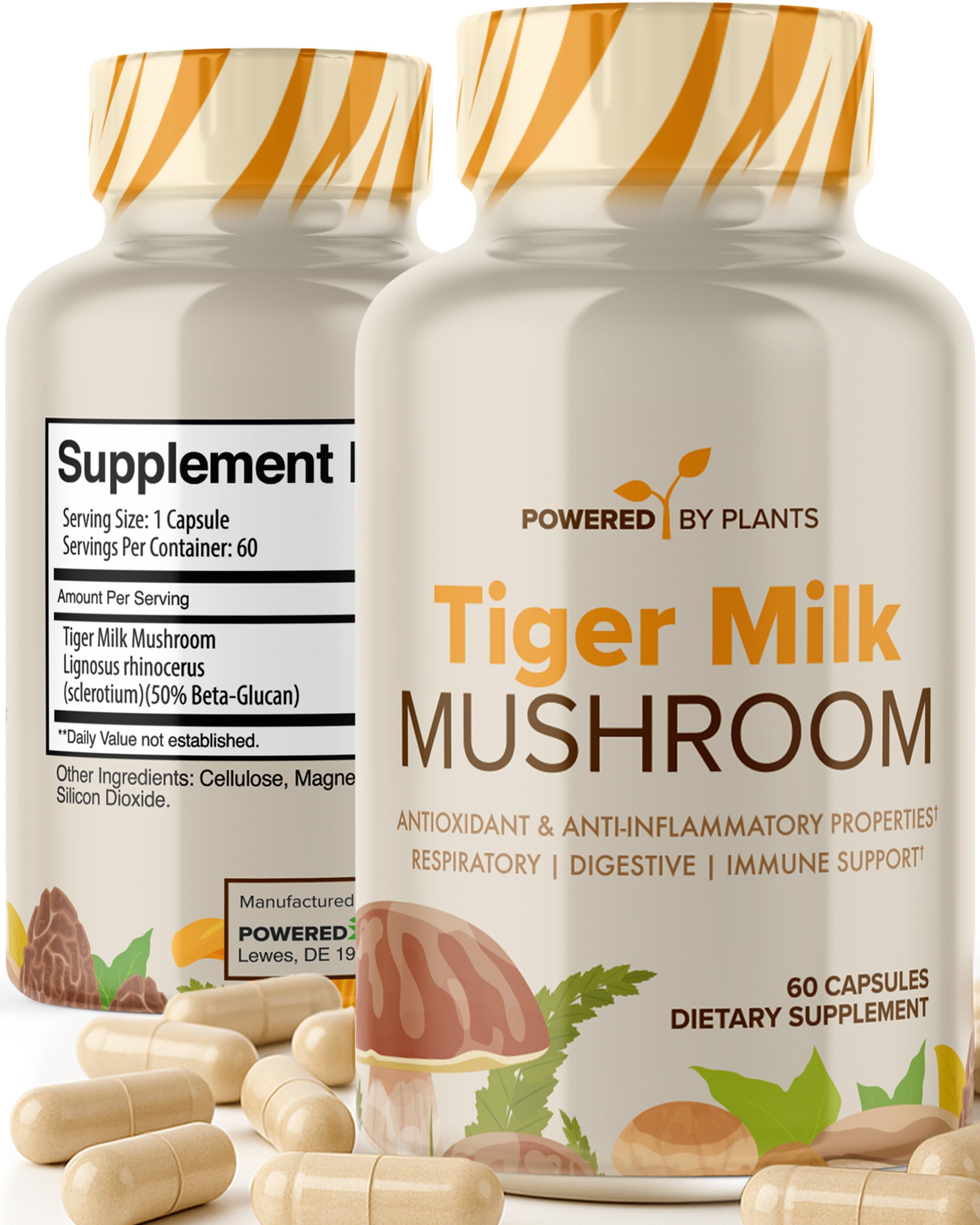 POWERED X PLANTS - Tiger Milk Mushroom Supplement - 500mg Per Capsule with 50% Beta-Glucan - Supports Respiratory Function Cognitive Clarity Digestive Balance & Immune Wellness - 60 Count