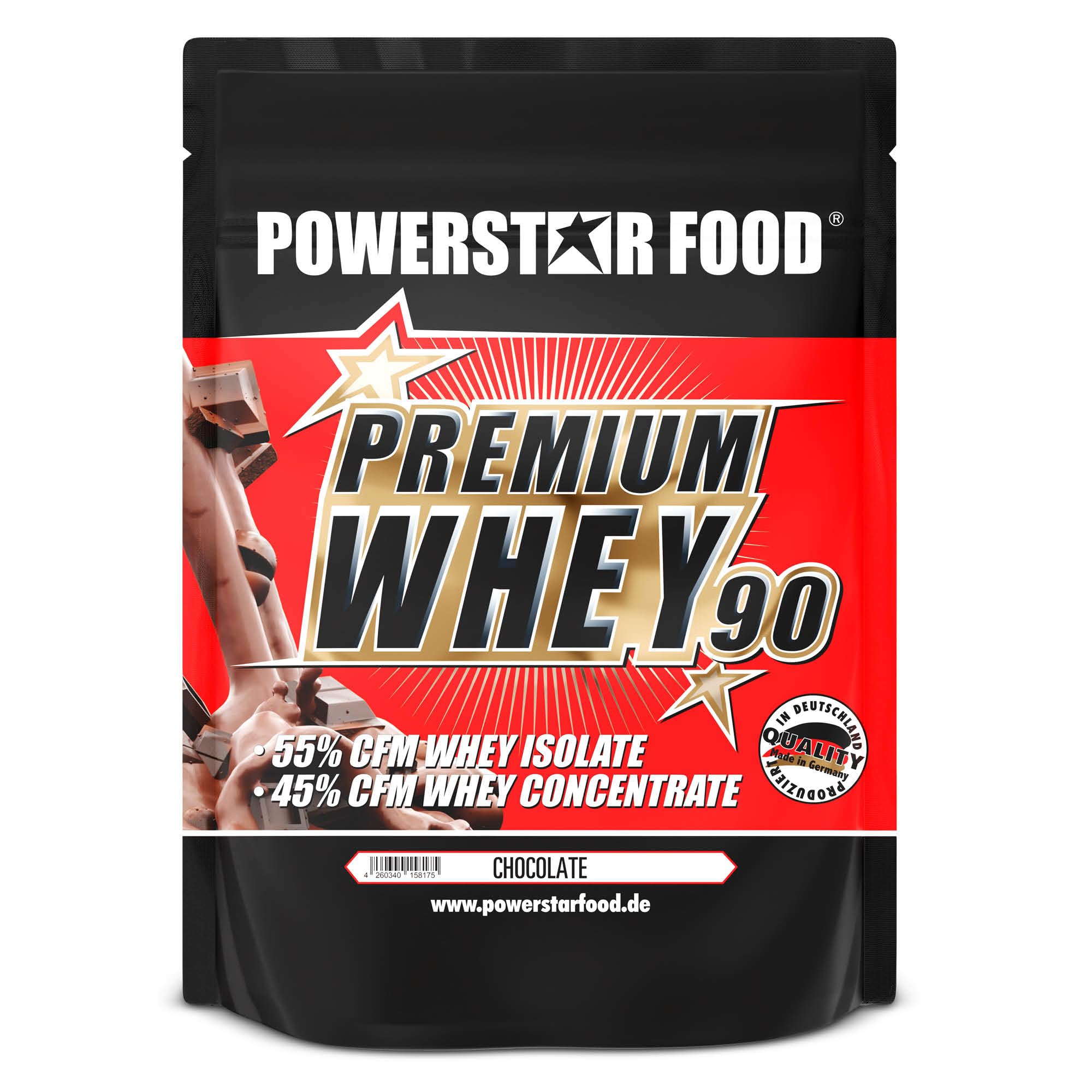 Powerstar Food PREMIUM WHEY 90 is a high-quality whey protein powder that, with a protein content of up to 90 i.Tr., is the ideal training companion. The supplement is composed of CFM Whey Concentrate (45 ) and CFM Whey Isolate (55 ) protein fractions, which are gently produced by cross-flow microfiltration. This results in a natural protein of the highest quality, ensuring a consistent protein supply. Our whey protein is derived exclusively from pasture-raised milk, which is particularly rich in linoleic acid and omega-3 fatty acids. The protein powder contains 49 essential amino acids and BCAAs. Thanks to bioactive protein components such as lactoferrin, alpha-lactalbumin, beta-lactoglobulin, and globulins, the body's natural post-workout recovery is optimally supported. Protein supplementation is complemented by valuable vitamins that stimulate protein synthesis. The high-quality formulation makes our whey protein powder ideal for muscle building and dieting. Thanks to its instant formula, the protein powder dissolves particularly easily in milk and water and reaches muscle cells even faster. The delicious protein shake is available in 10 different flavors – there's something for everyone!✓ UNIQUE TASTE: This 100 instant whey protein powder dissolves perfectly in milk and water. This delicious protein shake is the ideal companion for your workout and offers a wide variety of flavors for added variety. ✓ PASTURE-GRASSED PROTEIN: The whey protein in our sports powder comes from the milk of pasture-raised cows. Pasture-raised milk is particularly rich in linoleic acid and contains a higher proportion of omega-3 fatty acids than milk from conventionally raised animals. ✓ AWARD-WINNING GERMAN PRODUCTION: Since 1993, POWERSTAR FOOD has been producing nutritional supplements using the highest quality raw materials, in accordance with pharmaceutical standards. The exceptional quality of this protein supplement has been recognized with the DLG Gold Award. ✓ PREMIUM FORMULATION: This protein powder combines 49 essential amino acids with valuable vitamins, such as folic acid and niacinamide. This high-quality blend optimizes protein synthesis and reduces feelings of fatigue. ✓ HIGH PROTEIN POWDER: With up to 90 i.Tr. protein, this protein powder impresses with its high protein content, composed of 45 CFM whey concentrate and 55 CFM whey isolate, with only 1 fat and 1 carbohydrates per serving. This makes this protein shake perfect for building and maintaining muscle.Powerstar PREMIUM WHEY 90 Poudre de Protéine 850 g 80,6 Protéine Whey Protein Powder Produit en Allemagne 55 Isolat de Whey CFM 45 Concentrat CFM Riche en EAA BCAA Chocolate Chocolat 850 gDESCRIPTION DU PRODUIT Powerstar Food PREMIUM WHEY 90 est une poudre de protéine de lactosérum de haute qualité, qui, avec une teneur en protéines allant jusqu'à 90 i.Tr., est le compagnon d'entraînement idéal. Le complément est composé des fractions protéiques CFM Whey-Concentré (45 ) et CFM Whey-Isolat (55 ), qui sont produites en douceur par microfiltration à flux croisé. Cela donne une protéine naturelle de la plus haute qualité qui garantit l'approvisionnement en protéines. Notre protéine de lactosérum est exclusivement dérivée du lait de pâturage, particulièrement riche en acides linoléiques et en acides gras oméga-3. La poudre protéinée contient 49 d'acides aminés essentiels et de BCAAs. Grâce aux composants protéiques bioactifs tels que la lactoferrine, l'alpha-lactalbumine, le beta-lactoglobuline et les globulines, la régénération naturelle du corps après l'entraînement est optimalement soutenue. La supplémentation en protéines est complétée par des vitamines précieuses qui stimulent la synthèse des protéines. La formulation de haute qualité rend notre poudre de protéine de lactosérum idéale pour la construction musculaire et les régimes. Grâce à l'instantanéité complète, la poudre de protéines est particulièrement facile à dissoudre dans le lait et l'eau et atteint les cellules musculaires encore plus rapidement. Le délicieux shake protéiné est disponible en 10 saveurs différentes - il y en a pour tous les goûts !✓ GOÛT UNIQUE : La poudre de protéine de lactosérum est instantanée à 100 , elle est donc parfaitement soluble dans le lait et l'eau. Ce délicieux shake protéiné est le compagnon idéal pour votre entraînement et offre une grande variété de saveurs pour plus de diversité. ✓ PROTÉINE ISSUE DU LAIT DE PÂTURAGE : La protéine whey de notre poudre pour sportifs provient du lait de vaches élevées en pâturage. Le lait de pâturage est particulièrement riche en acides linoléiques et contient une proportion plus élevée d'acides gras oméga-3 que le lait des animaux d'élevage. ✓ FABRICATION ALLEMANDE RÉCOMPENSÉE : Depuis 1993, POWERSTAR FOOD produit des compléments alimentaires à base de matières premières de la plus haute qualité, conformes aux normes pharmaceutiques. La qualité exceptionnelle de ce complément protéiné a été récompensée par le prix d'or DLG. ✓ FORMULATION PREMIUM : Cette poudre de protéines combine 49 d'acides aminés essentiels avec des vitamines précieuses, telles que l'acide folique et la niacinamide. Ce mélange de haute qualité optimise la synthèse des protéines et réduit la sensation de fatigue. ✓ POUDRE HAUTE EN PROTÉINES : Avec jusqu'à 90 de protéines i.Tr., cette poudre de protéines séduit par sa haute teneur en protéines, composée de 45 de concentré de whey CFM et de 55 d'isolat de whey CFM, avec seulement 1 de matières grasses et 1 de glucides par portion. Cela rend ce shake protéiné parfait pour la construction et le maintien musculaire.