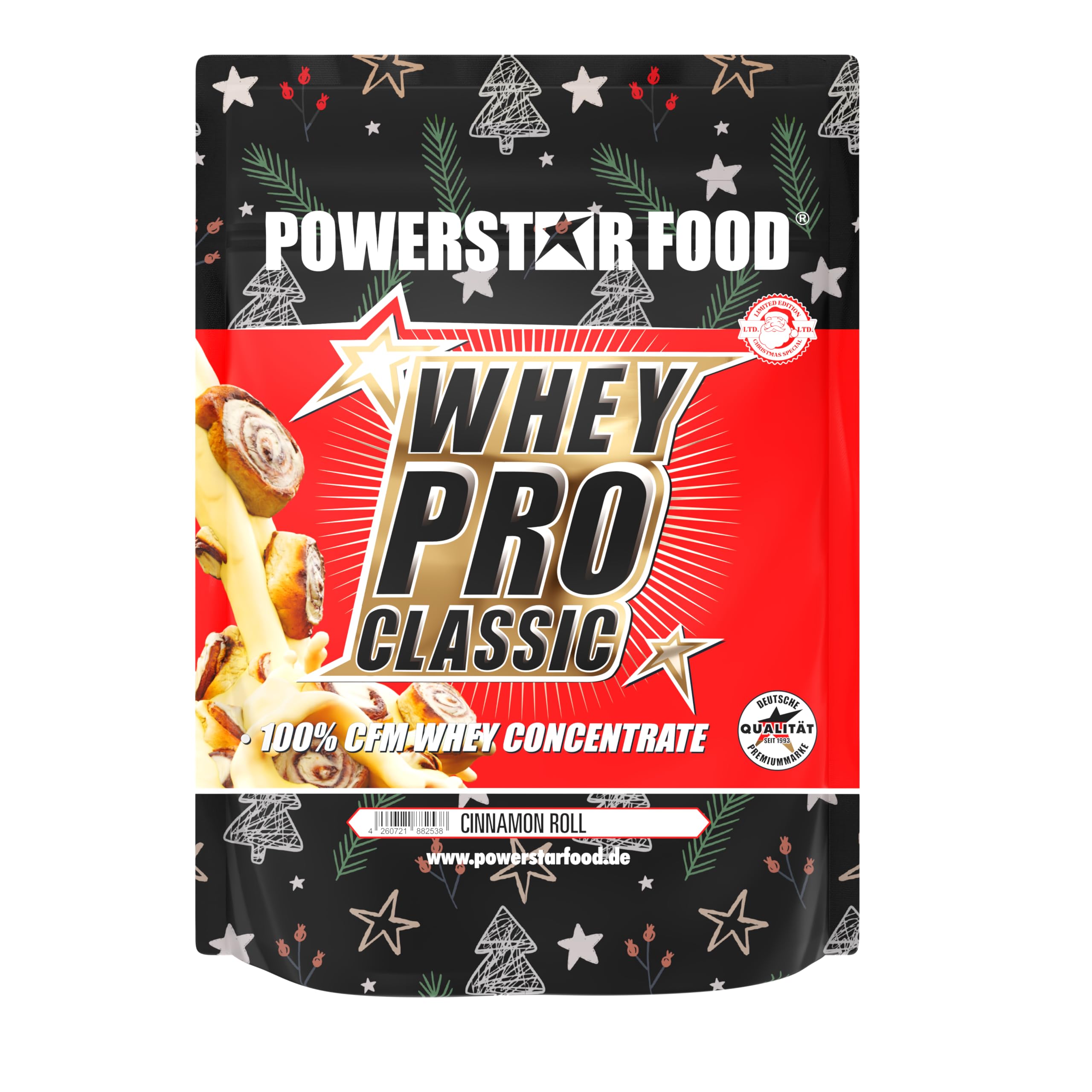 Whey Pro Classic from POWERSTAR FOOD Whey Pro Classic is a high-quality 100 CFM whey protein concentrate. It provides up to 78 protein in ready-to-eat powder (natural variant) and boasts a pleasant, milky consistency and a full-bodied taste, without any artificial aftertaste or watery texture. Natural origin and gentle processing - Made from willow milk from grass-fed cows - Gentle cross-flow microfiltration to produce undenatured protein with high bioavailability and excellent tolerability - Maximum biological value of 104 - Complete amino acid profile - Contains all essential amino acids, including a high proportion of BCAAs. Protein contributes to the growth and maintenance of muscle mass (EU approved claim) - Recommended use: Thanks to its instantization process, the powder dissolves easily in milk or water and is suitable as a protein source as part of a balanced diet. For the recommended serving size, please refer to the information on the packaging. Quality and enjoyment – 100 pure whey protein concentrate – No artificial additives such as magnesium stearate – Developed and manufactured in Germany according to IFS guidelines INGREDIENTS Instant whey protein isolate 55 (contains sunflower lecithin emulsifier), instant whey protein concentrate 45 (contains sunflower lecithin emulsifier), flavoring, sweetener (sodium cyclamate, sodium saccharin, neohesperidin), acid (citric acid), ascorbic acid (vitamin C), nitric acid. acinamide, damide L-alpha-tocopherol acetate (vitamin E), calcium pantothenate (pantothenic acid), riboflavin (vitamin B2), pyrodoxine hydrochloride (vitamin B6), thiamine hydrochloride (vitamin B1), folic acid, biotin, methylcobalamin (vitamin B12)Made in Germany and additive-free – Manufactured according to IFS standards, without magnesium stearate or artificial colors. Note: Food supplements are not a substitute for a balanced diet. Creamy consistency and optimal solubility – Instant powder that dissolves quickly in water or milk – No artificial aftertaste or watery texture. Complete amino acid profile with BCAAs – Contains all essential amino acids. Protein contributes to the maintenance and growth of muscle mass. Premium pasture-raised milk and cross-flow microfiltration – Gentle filtration technology using grass-fed cow's milk for undenatured, bioavailable protein with a biological value of 104. 100 CFM whey protein concentrate (78 protein) – High-quality, high-protein whey protein for targeted protein intake as part of a balanced diet.Powerstar Whey Pro Classic Édition hiver Poudre de protéines de lactosérum 1000 g Poudre de protéines Fabriqué en Allemagne 100 concentré de lactosérum CFM Poudre de protéines avecDESCRIPTION DU PRODUIT DESCRIPTION DU PRODUIT Whey Pro Classic de POWERSTAR FOOD Whey Pro Classic est un concentré de protéines de lactosérum de qualité 100 CFM. Il fournit jusqu'à 78 de protéines dans la poudre prête à manger (variante naturelle) et convainc par une consistance laiteuse agréable et un goût complet, sans arrière-goût artificiel ni texture aqueuse. Origine naturelle et traitement doux - Fabriqué à partir de lait de saule provenant de vaches nourries à l'herbe - Microfiltration à flux croisé doux pour produire une protéine non dénaturée avec une biodisponibilité élevée et une excellente tolérance - Valeur biologique maximale de 104 - Profil complet d'acides aminés - Contient tous les acides aminés essentiels, y compris une forte proportion de BCAA. Les protéines contribuent à la croissance et préservation de la masse musculaire (claim approuvé par l'UE) - Recommandation d'utilisation : grâce à l'instantanation, la poudre se dissout facilement dans le lait ou l'eau et convient comme source de protéines dans le cadre d'une alimentation équilibrée. Pour la quantité de consommation recommandée, veuillez vous référer aux informations sur l'emballage. Qualité et plaisir – Concentré de protéines de lactosérum 100 pur – Sans additifs artificiels tels que le stéarate de magnésium – Développé et fabriqué en Allemagne selon les directives IFS INGRÉDIENTS Isolat de protéines de lactosérum instantané 55 (contient émulsifiant lécithine de tournesol), concentré de protéines de lactosérum instantané 45 (contient émulsifiant lécithine de tournesol), arôme, édulcorbique (cyclamate de sodium, saccharine de sodium, néohespéridine), acidifiant (acide citrique), acide ascorbique (vitamine C), nitrique. acinamide, damide Acétate de L-alpha-tocophérol (vitamine E), pantothénate de calcium (acide pantothénique), riboflavine (vitamine B2), chlorhydrate de pyrodoxine (vitamine B6), hydrochlorure de thiamine (vitamine B1), acide folique, biotine, méthylcobalamine (vitamine B12)Fabriqué en Allemagne et sans additifs - Fabriqué selon les normes IFS, sans stéarate de magnésium ni colorants artificiels. Remarque : les compléments alimentaires ne remplacent pas une alimentation équilibrée. Consistance crémeuse et solubilité optimale - Poudre instantanée qui se dissout rapidement dans l'eau ou le lait - Sans arrière-goût artificiel ni texture aqueuse. Profil complet en acides aminés avec BCAA – Contient tous les acides aminés essentiels. Les protéines contribuent au maintien et à la croissance de la masse musculaire. Lait de pâturage de qualité supérieure et microfiltration à flux croisé – Technologie de filtration douce à base de lait de vache nourri à l'herbe pour des protéines non dénaturées et biodisponibles de valeur biologique 104. 100 concentré de protéines de lactosérum CFM (78 de protéines) - Protéines de lactosérum de haute qualité à haute teneur en protéines pour un apport en protéines ciblé dans le cadre d'une alimentation équilibrée.