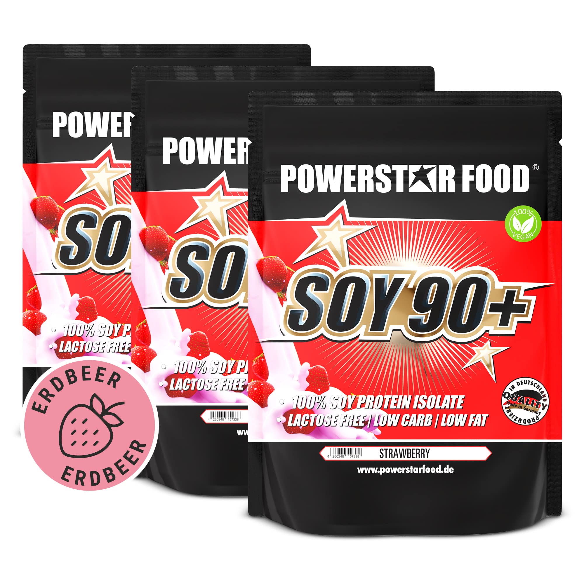 Powerstar SOY 90+ | 3kg Soja-Protein-Isolat ohne Zucker-Zusatz | Made in Germany | Gentechnisch unverändert | Pflanzliches Eiweiß-Pulver mit 93% Protein i.Tr. | Vegan & laktosefrei | Strawberry Erdbeere 1 kg (3er Pack)