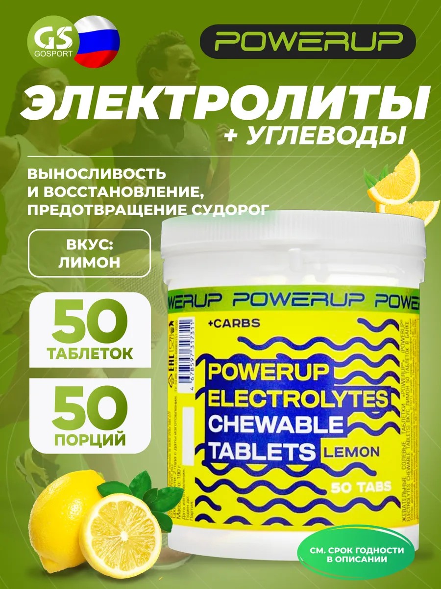 Expires until May 15, 2026. Electrolytes Chewable Tablets, 50 Tablets, Lemon. POWERUP Electrolytes is a comprehensive product that provides sodium, potassium, calcium, magnesium, phosphorus, as well as chlorides and carbohydrates. POWERUP salt tablets help replenish electrolyte levels in the body. They support physical activity, increase endurance, and prevent muscle spasms and cramps, as well as reduce recovery time after exercise. Sodium is the main mineral found in salt and is essential for body health. In the blood, sodium helps maintain proper fluid balance and transport glucose. This electrolyte is important for muscle contractions, transmission of nerve impulses, and the delivery of nutrients to cells. Potassium is a vital electrolyte that works in tandem with sodium. The sodium-potassium pumps found in our cells use both of these electrolytes to generate electrical energy in nerves and muscles. Potassium also helps protect the kidneys and strengthen the stomach. Magnesium helps muscles and the body relax, calming the nervous system and preventing cramps and spasms. Calcium is a strong electrolyte used for the growth, repair, and strengthening of teeth and bones. Chloride helps maintain the body's acid-base balance and fluid balance. Phosphorus is essential for energy production, muscle and nervous system function, and bone growth. Absorbed from the gastrointestinal tract into the blood, glucose is the main source of energy and also positively affects the bioavailability of electrolytes. As a general guideline, athletes should take one tablet every 30-60 minutes during any land-based activity (cycling/running) throughout the workout. Chewable tablets dissolve quickly in the mouth. Directions for use: Take 1-2 tablets per hour during intense exercise. Composition per 1 serving (1 tablet): sodium 47.42 mg; potassium 17.78 mg; magnesium 6.0 mg; calcium 7.41 mg; phosphorus 42.59 mg; chlorides 85.00 mg; carbohydrates (glucose) 3.2 g
