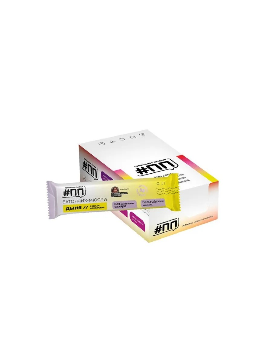 A sugar-free, low-carb, and low-calorie PP muesli bar with white chocolate. Less than 100 kcal per bar. The aroma of ripe melon pairs perfectly with the delicate taste of real Belgian chocolate. Cereal balls are an additional source of essential fiber. Juicy melon pieces and maltitol syrup + isomalt, which have a low glycemic index, add sweetness to the bar. Real Belgian white chocolate without sugar. Suitable for dieters, athletes, and diabetics. The best low-calorie snack! Ingredients: sweeteners: maltitol syrup, isomalt; Extruded cereal balls (corn, rice and wheat flour, salt), dried pineapple, sugar-free white chocolate (sweetener maltitol, cocoa butter, whole milk powder, whey powder, inulin, emulsifiers (soy lecithin, E476), vanilla extract), dried apples, coconut oil, dried papaya, banana chips, oat flakes, emulsifier soy lecithin, acidity regulator citric acid, flavoring.