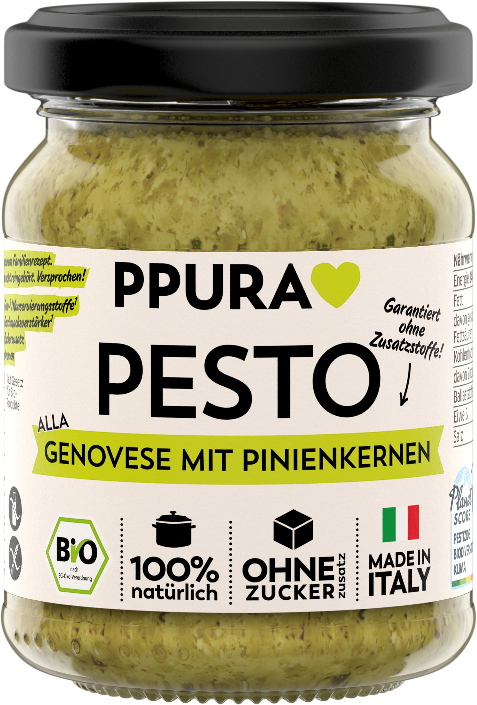 Our organic pesto alla genovese is Italy's classic pesto, made with the finest ingredients from the original Genoese recipe: small-leaf Italian basil, aged Parmigiano Reggiano, spicy Pecorino Romano, organic pine nuts, and extra virgin olive oil. And it's all 100 natural. That means we forgo sugar additives, colorings, and artificial additives. Just like Mom made it. Enjoy! P.S.: Handcrafted in Italy, this pesto is ideal for pasta and bread. INGREDIENTS Basil (52 ) , extra virgin olive oil , ITAL. Hard cheeses (PECORINO , PARMIGIANO-REGGIANO D.O.P. ), lemon juice , pine nuts (4 ), garlic , sea salt, and lots of love. All organically grownPPURA Bio Pesto alla Genovese Sauce pour pâtes avec pignons de pin, basilic, Parmigiano Reg., Peccorino Nat. Huile d'olive Extra Pesto vert fabriqué en Italie 100 naturel sans additifs VerreDESCRIPTION DU PRODUIT DESCRIPTION DU PRODUIT Notre pesto alla genovese bio est le pesto classique d'Italie et vient chez nous avec les meilleurs ingrédients de la recette originale de Gênes : basilic italien à petites feuilles, Parmiggiano Reggiano vieilli, pecorino romano épicé, pignons de pin bio et huile d'olive extra vierge. Et tout cela est 100 naturel. Cela signifie que nous renonçons aux additifs de sucre, aux colorants et aux additifs artificiels. Comme pour maman. Buon appétit PS : fabriqué artisanalement en Italie, le pesto est idéal pour les pâtes et le pain. INGRÉDIENTS Basilic (52 ) , huile d'olive extra vierge , ITAL. Fromages durs (PECORINO , PARMIGIANO-REGGIANO D.O.P. ), jus de citron , noyaux de pin (4 ), ail , sel de mer et beaucoup d'amour. Tous issus de l'agriculture biologique