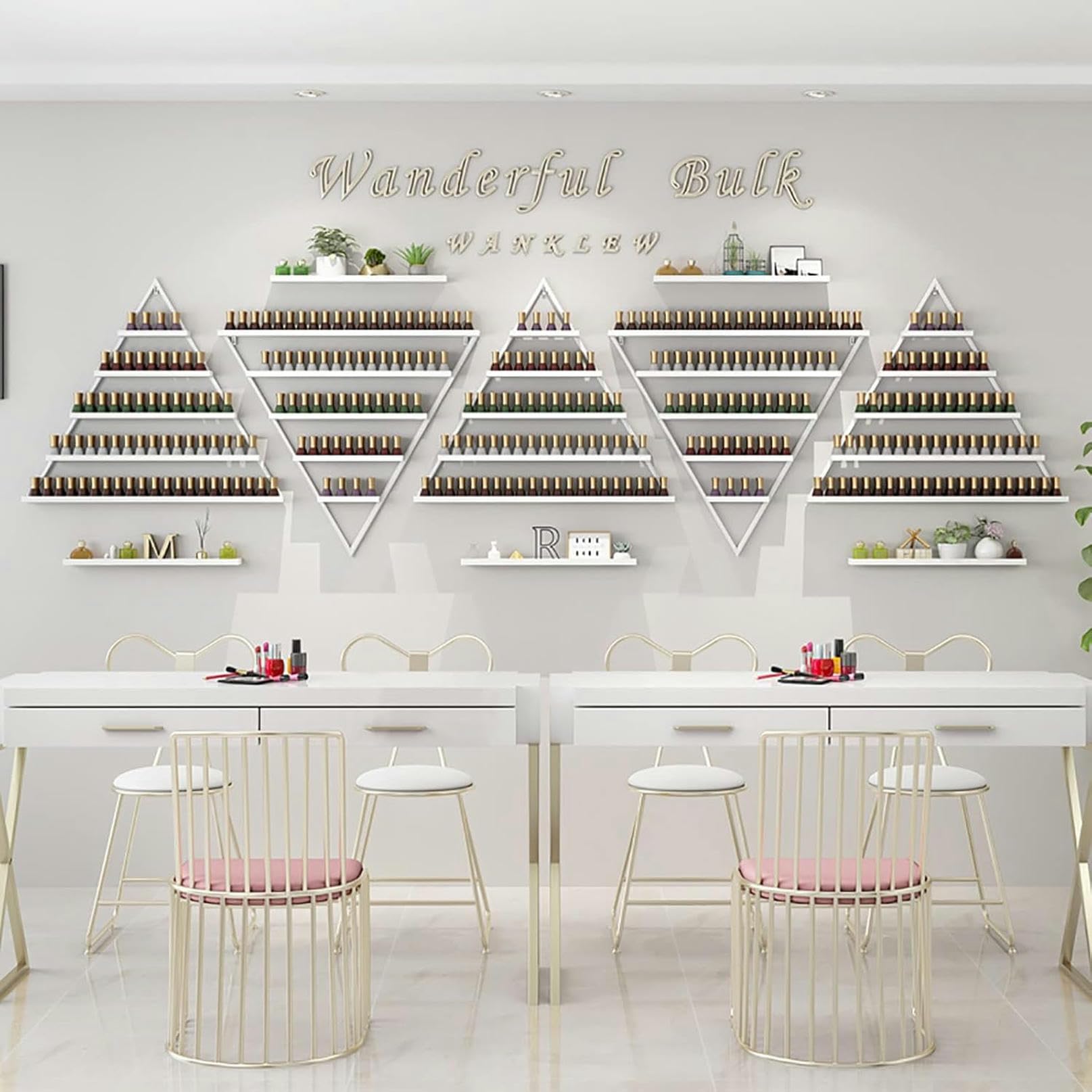 Metal wall-mounted nail polish rack, triangular cosmetic display stand, essential oil bottle shelf, gold storage rack for lipstick, perfume, for spa, nail salon, boutique, home. Product Name: Nail Art. Material: Iron. Product Color: Gold, Pink, White, Black. 4-piece set (1 upright bar 1 downhill bar 1 horizontal bar), maximum capacity of 240 bottles, occupying a total wall length of 1.4 m, occupying a total wall height of 0.9 m. 6-piece set (2 upright bars 1 downhill bar 3 horizontal bars), maximum capacity of 350 bottles, occupying a total wall length of 1.5-1.6 m, occupying a total wall height of 0.9 m. 8-piece set (2 upright bars 2 downhill bars 4 horizontal bars), maximum capacity of 480 bottles, occupying a total wall length of 2.2 m and a total wall height of 0.9m Set of 10 pieces (3 upright bars 2 inverted bars 5 horizontal bars), maximum capacity of 550 bottles, occupying a total wall length of 2.4 to 2.5m, occupying a total wall height of 0.9m. Simple triangle: with a maximum capacity of 90 bottles, representing 0.66m of the total wall length and 0.7m of the total wall height. Placement rows: 1 row and 2 rows. Scope of application: home wall racks, shopping mall displays, nail salon storage racks, cosmetic showcases. Product placement: hanging. Features: Wall-mounted display, sturdy and durable, multi-layered, easy to install, excellent decorative effect, wide range of applications. Installation method: drilling installation