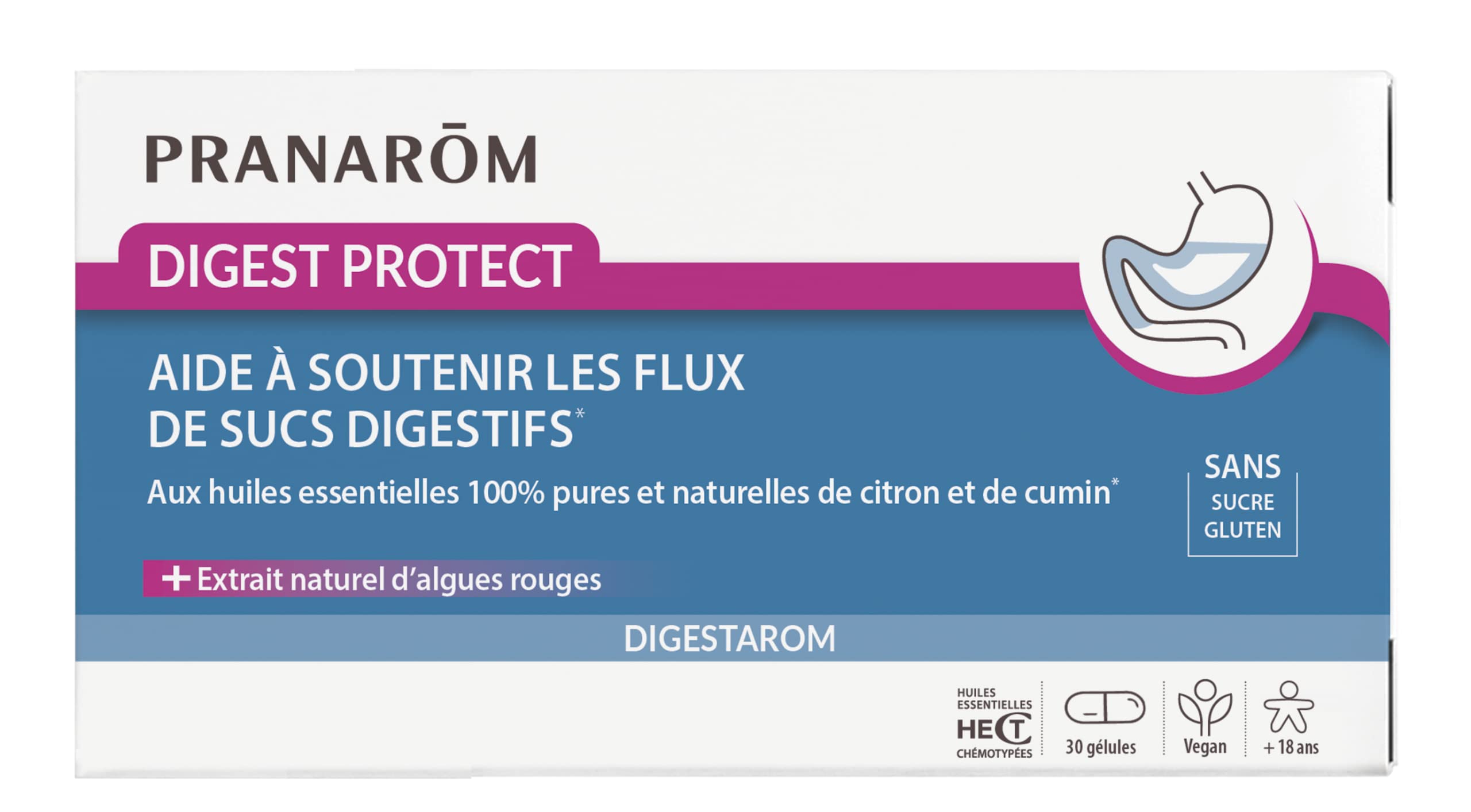 : For over 30 years, Pranarôm Laboratories has been developing its expertise and is today the undisputed leader in innovative solutions formulated with 100 natural, 100 pure (not mixed with inferior oils), and 100 whole (undiluted, unbleached, and unrectified) organic essential oils for alternative healthcare. Pranarôm provides access to the finest essential oils through meticulous selection of raw materials and a rigorous scientific approach. Digestion, respiration, immune system support, maternity… Pranarôm solutions offer targeted answers in all areas of health and are suitable for the whole family. DIGEST PROTECT is a 100 natural solution from Pranarôm Laboratories, designed to support the flow of digestive juices and provide improved digestive comfort, especially after meals. Combining marshmallow root, lithothamnium powder, and organic essential oils, this solution helps optimize overall digestion and restore digestive balance. Ingredients (per 4 capsules): Thickener: sodium alginate lithothamnium powder (Lithothamnium calcareum) 580 mg Acidity regulator: sodium bicarbonate Coating agent (vegetarian capsule): hydroxypropylmethylcellulose Marshmallow root extract (Althaea officinalis) 440 mg Essential oil blend: Peppermint (Mentha x piperita) 25 mg, Ginger (Zingiber officinalis) 25 mg, Lemon (Citrus limon) 20 mg, Cumin (Cuminum cyminum) 15 mg, Lemongrass (Cymbopogon citratus) 15 mg Anti-caking agents: silicon dioxide, magnesium stearate. Directions for use: From age 18: Swallow 2 capsules with a little water after meals, once or twice a day. Safety Warning: Keep out of reach of young children. store away from heat and light. This product is not a substitute for a varied and balanced diet and a healthy lifestyle. Do not exceed the recommended daily dose. Do not use for more than 5 consecutive days, unless advised by a healthcare professional. Do not use during pregnancy or breastfeeding, or if under the age of 18. Not recommended for people with thyroid disorders, gallstones, seizures, or a history of neurological conditions. Consult your doctor or pharmacist if you are taking anticoagulants or antiplatelet drugs. See more