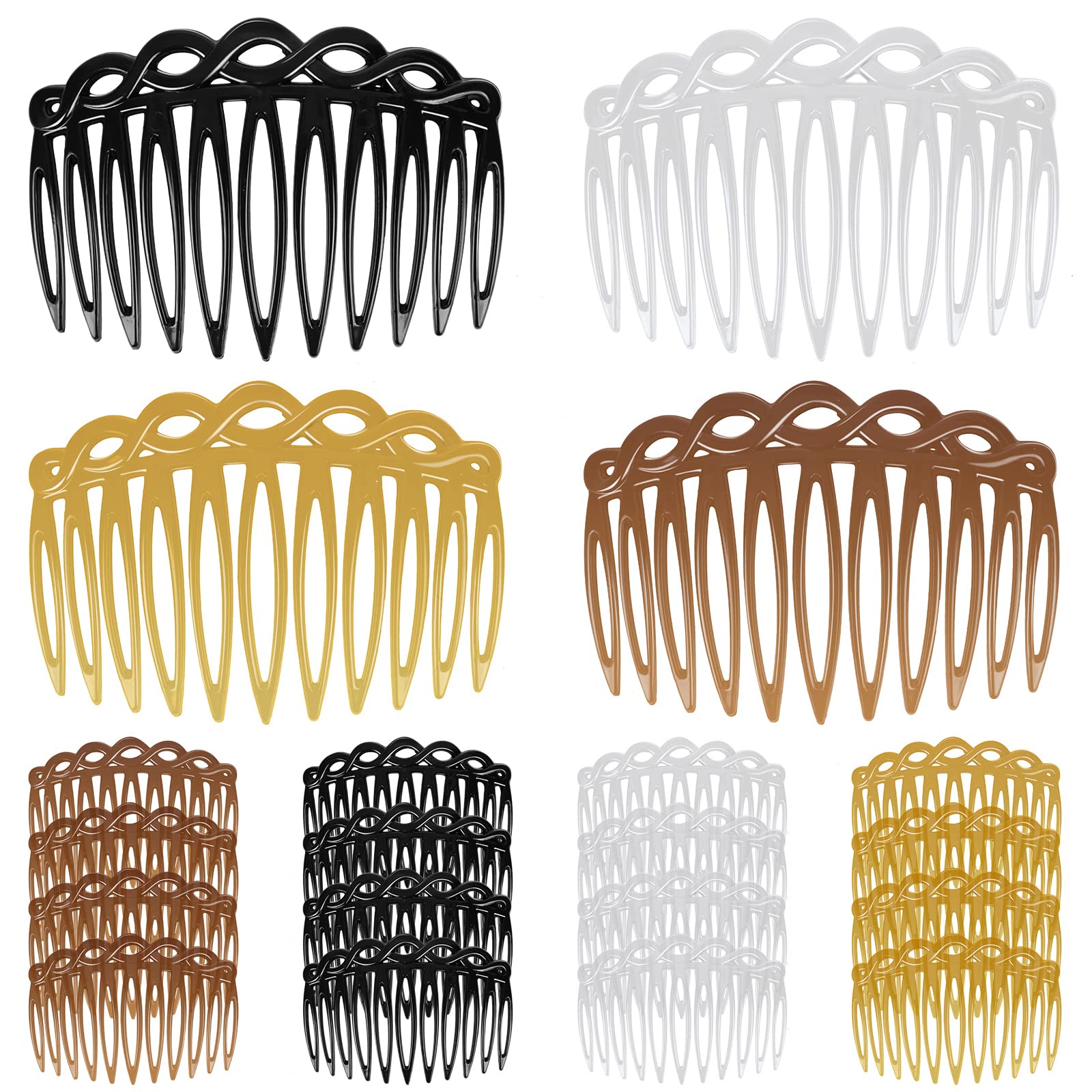 this classic side comb makes you look elegant and sophisticated, 4 colors can match any hair color and styles, it is a stylish hairdressing tool that is suitable for curly wavy straight hair and curly hair Category: 6-piece hair clip set Colour: Floral Material: Resin Function: Hair decoration Product size: 7.5 x 5.3cm Set size. 16.5 x 11. x 1.9cm 6.44 x 4.29 x 0.74 in Package dimensions 17 x 11.5 x 2 cm 6.33 x 4.49 x 0.78 inch Packaging: Bagged Net weight: 90g 3.18 oz Gross weight: 92g 3.25 oz Packing list: 16PCS* hair clipsMultiple uses: our hair pins for women can be applied to fix bangs, fix hair, pan heads, decorations, etc., suitable for parties, birthdays, events, anniversaries, holidays, weddings and daily wear and many other occasions. Easy to carry: the comb clip is small in size and light in weight, you can carry it with you no matter for business trips or travel, will neither occupy much space, nor burden your luggage, so that you can keep a clean and tidy hairstyle all the time. Durable enough for a long time using: our teeth hair clip combs accessories are made from quality plastic material, the side comb is smooth in the edges, which will not damage the hair, reduce entanglement and prevent the hair from damage,not easy to fade or break; The sturdy performance will serve you for a long time. Dimension: the size of each French twist comb hair clip measures approx. 7.5 cm/ 2.95 inches in total length, and the length of the rounded teeth is approximately 4 cm/ 1.57 inches, designed with 11 teeth,can fit for most hair types, hold hair tightly and hard to fall off. Practical hair side combs set: you will get 16 pieces of plastic hair combs for women accessories ,4 colors for each style including, there are black, transparent, light coffee and dark coffee for you to choose.