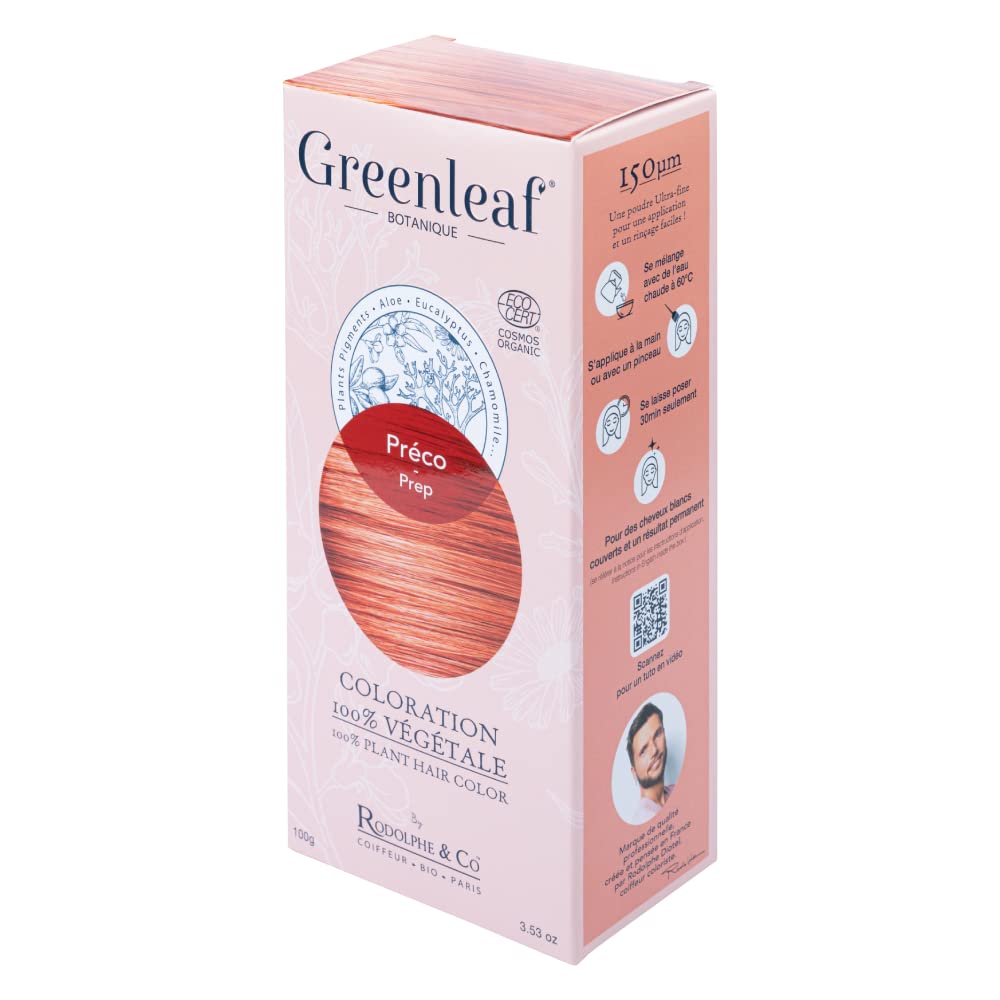 Have you always dreamed of a natural, professional-quality, 100 organic hair color? Rodolphe offers Greenleaf Botanique hair colors to take care of your colored hair between each visit to the hair salon. PRECO is an exclusive pre-coloring base. Its 100 organic certified formula guarantees that your Greenleaf Botanique plant-based hair color will take effect on your gray hair. For a color with natural highlights that reflects the values of excellence and respect for professional hairdressing.100 gray hair coverage. Professional effectiveness. 100 plant-based. 100 certified organic. Vous avez toujours rêvé d'une coloration naturelle, de qualité professionnelle 100 biologique ? Rodolphe vous propose les colorations Greenleaf Botanique pour prendre soin de vos cheveux colorés entre chaque passage en salon de coiffure. PRECO est une base de précoloration exclusive. Sa formule certifiée 100 biologique vous garantit la prise de votre coloration végétale Greenleaf Botanique sur vos cheveux blancs. Pour une couleur aux reflets naturels dans les valeurs de l'excellence et du respect de la coiffure professionnelle.Couverture à 100 des cheveux blancs. Efficacité professionnelle. 100 plantes. 100 biologique certifié.