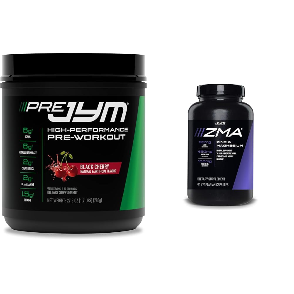 PRE JYM 30 Servings - Black Cherry Pre JYM Pre Workout Powder - BCAAs, Creatine HCI, Alpha-GPC, Beet Root, Citrulline Malate, Beta-Alanine, Betaine, Huperzine, and More JYM Supplement Science Black Cherry, 30 Servings JYM Supplement Science ZMA Zinc Magnesium Capsules Supplement - Zinc, Magnesium and Vitamin B6 JYM Supplemental Science 90 Vegetarian Capsules About the JYM Zinc Magnesium Capsules Supplement: Supported Goals: Hormone Health - Sleep Quality - Recovery - Power - Endurance What It Is: JYM Supplement Science combines real science with best-in-class ingredients and precise doses to deliver unreal results. ZMA JYM is a real, effectively dosed ZMA formula with enhanced bioavailability. Due to the forms of zinc and magnesium used, and the addition of vitamin B6, along with added BioPerine, ZMA JYM is the most effective way for athletes and other hard-training individuals to get adequate zinc and magnesium. These two essential minerals are critical for maintaining optimal hormone levels and maximizing muscle strength. It's important to supplement zinc and magnesium, because you may actually be deficient in both!What Sets It Apart: ZMA JYM is not just zinc, magnesium, and vitamin B6 thrown into a bottle. ZMA JYM contains specific forms of these minerals that enhance their uptake and utilization by the body. ZMA JYM specifically uses zinc mono-L-methionine, and aspartate and magnesium aspartate. This is critical because there are two forms of zinc monomethionine: zinc mono-L-methionine and zinc mono-D-methionine. Only the "L" form is readily absorbed and used by the body. The human body is not able to use the "D" form. Some bogus products use a combo of both the "L" and "D" form. The D form actually inhibits the absorption of the L form and undermines zinc uptake. If a product does not specifically list zinc mono-L-methionine, and instead lists zinc monomethionine, don't bother with it. An easy way to ensure that a product uses real ZMA is to look for the SNAC System trademark listed on the bottle. Anything else is an imposter.Product 2: PROPER RATIOS: Each dose of ZMA JYM delivers the perfect form and dose of zinc (30 mg), magnesium (450 mg), and vitamin B6 (10.5 mg), as well as an effective the recommended dose of Bioperine (5 mg), which has been shown to enhance the uptake of zinc, magnesium and B vitamins. Product 2: MORE RESULTS: Studies have shown that supplementing with ZMA maximizes testosterone levels as well. This helps to promote more muscle and strength for athletes and gym rats. Product 2: Product Note: Exposure to heat or sunlight may lead to melting damage of product. Hence customers are expected to be available during the product delivery. Product 2: DEFEATING DEFICIENCIES: Those who train hard in the gym are often deficient in two critical minerals – zinc and magnesium – which negatively affects performance and can impact overall health. ZMA JYM counteracts this with proper amounts of both minerals. Product 1: Enhanced strength endurance- Creatine HCl, beta-alanine and Betaine help fuel your muscles for more strength and stamina during workouts. The BCAAs (branched-chain amino acids) found in pre JYM provide a direct source of energy during your workout. Product 1: Great taste - no other pre-workout supplement surpasses the great taste, texture, and nutrition of pre JYM. Simply mix with 12-32 ounces of water and drink 30 minutes before your workout for the best results. Product 1: Product Note: Exposure to heat or sunlight may lead to melting damage of product. Hence customers are expected to be available during the product delivery. Product 1: Quality ingredients - pre JYM pre-workout powder contains the best ingredients to optimize your workout. It has bccaa's and Creatine for muscle growth, Citrulline Malate and caffeine for endurance, plus beta-alanine and Betaine for strength.
