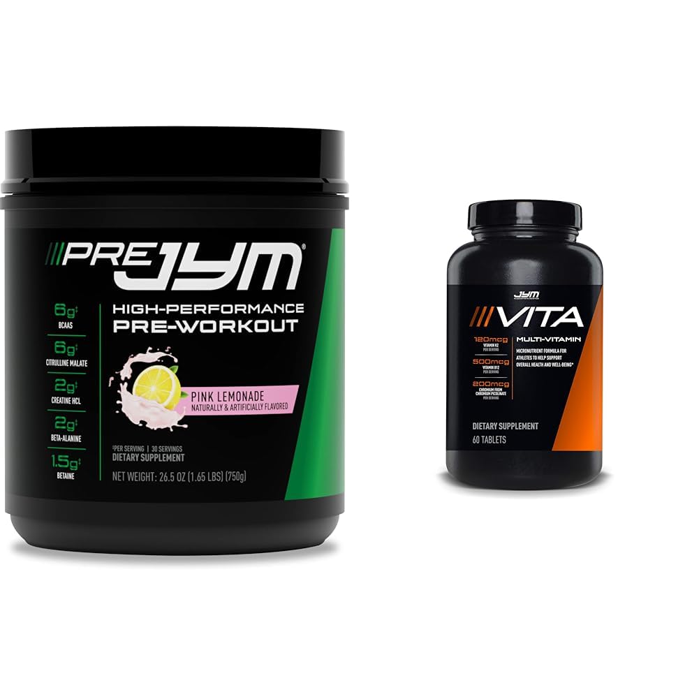 The Pre JYM 30 Servings - Pink Lemonade pre-workout supplement and the Vita JYM 60 tablet multivitamin bundle provides comprehensive nutritional support for athletes and active individuals. The Pre JYM pre-workout contains 13 research-backed ingredients like BCAAs, citrulline malate, creatine, beta-alanine, caffeine and more to enhance strength, endurance, focus and recovery during workouts without heavy stimulants. It has a large 25 gram scoop size to provide full clinical doses of ingredients to optimize workout performance and comes in a great tasting pink lemonade flavor. The Vita JYM multivitamin packs over 25 key micronutrients like vitamins A, B-complex, C, D, E and K plus minerals such as chromium and selenium to support immune function, heart health, joint health and workout recovery. It uses highly bioavailable forms of vitamins A and K and excludes minerals like zinc, magnesium and calcium that can interfere with absorption. Vita JYM also includes 5mg of BioPerine to further boost nutrient absorption. Together, these two supplements provide a powerful combination of performance-enhancing and recovery-supporting ingredients to help athletes and gym-goers enhance their workouts, build strength and muscle, and bounce back faster. The Pre JYM fuels your toughest training sessions while the Vita JYM fills any nutritional gaps to optimize results. This bundle offers great value for anyone looking to take their fitness to the next level.No proprietary blends, just complete transparency of world-class formulations from doctor and expert Dr. Jim Stoppani. Versatile bundle great for both men and women interested in more energy, bulking up, or getting ripped. Vita JYM includes vitamin A as beta-carotene, vitamin K as menaquinone, and BioPerine to maximize benefits. Pre JYM promotes strength, endurance and focus while Vita JYM enhances recovery and absorption of nutrients. Contains pre JYM pre-workout with 13 performance-enhancing ingredients including BCAAs, citrulline malate, and caffeine plus the athlete's multivitamin Vita JYM with over 25 key micronutrients.