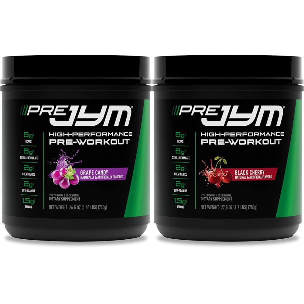 This bundle pairs two 30-serving containers of Pre JYM pre-workout powder to enhance your training performance and promote sustainable results. The grape candy and black cherry flavored powders provide a precise blend of 13 science-backed ingredients. Caffeine, BCAAs, creatine HCI, citrulline malate, beta-alanine, and more work together to support mental focus, muscular endurance, and strength. The full ingredient disclosure sets Pre JYM apart from proprietary blends. The 25-gram scoop also ensures you get the right doses, unlike the underdosed 5-10 gram scoops of some pre-workouts. Creatine HCI, beta-alanine and betaine supply energy to muscles for increased strength and stamina. BCAAs provide direct energy, while caffeine and huperzine A support mental focus so you feel ready to intensely train without jitters or crashing. With 60 total servings, this bundle offers a versatile pre-workout to optimize workouts for both men and women, whether your goals are muscle growth, endurance, or getting ripped. The two great tasting flavors can be easily mixed with water and taken 30 minutes before intense training for enhanced results.