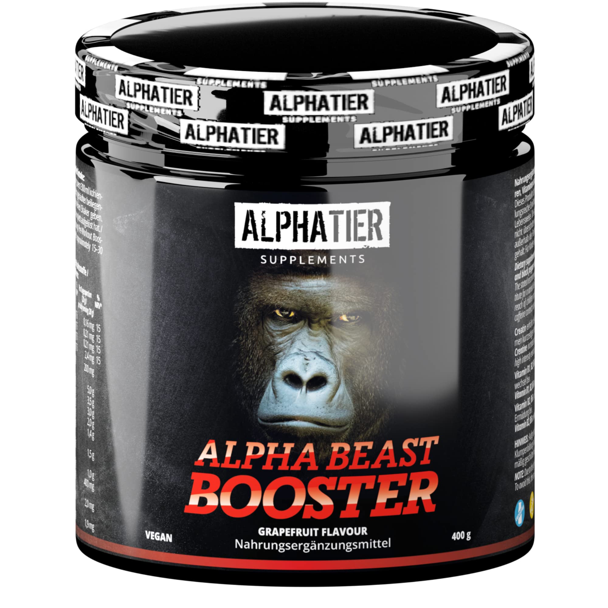 ✓Application: 20g powder (1 heaped measuring spoon) with 300ml of water approx. 15-30 minutes before the workout - perfect in combination with alpha animal amino acids Citrullin Malat arginine - Made in Germany.✓Laboratory testing: Premium quality of nutritionists developed - in Germany according to the strictest quality standards produced nutritional supplements - ISO 9001, HACCP and GMP - disposable PET box.✓Fitness and bodybuilding: Optimal matrix made of macro and micronutrients - Energy nutrient formula designed by nutritionists - Low -Carb Dietary supplements for strengthport training.✓Quality: gluten -free - lactose -free - without aspartame, stimulants, sugar, milk protein, dyes, gelatin or preservatives - muscle booster powder without magnesium stearate - supplement for men women.✓Highly dosed: Pre Workout Drink with Caffeine, L-Arginine, L-Citrulline, creatine, beta-alanine, l-ornithin, taurine, betaine, acetyl tyrosine B vitamins-Effective vegan training booster without crash.✓ANWENDUNG: 20g Pulver (1 gehäufter Messlöffel) mit 300ml Wasser ca. 15-30 Min. vor dem Workout einnehmen - perfekt in Kombination mit Alphatier Aminosäuren Citrullin Malat Arginin - Made in Germany. ✓LABORGEPRÜFT: Premiumqualität von Ernährungswissenschaftlern entwickelt - in Deutschland nach strengsten Qualitätsstandards produzierte Nahrungsergänzung - ISO 9001, HACCP und GMP - Einweg PET-Dose. ✓FITNESS und BODYBUILDING: Optimale Matrix aus Makro- und Mikronährstoffen - von Ernährungswissenschaftlern konzipierte Energie Nährstoffformel - Low-Carb Nahrungsergänzungsmittel für Kraftsport Training. ✓QUALITÄT: Glutenfrei - Laktosefrei - ohne Aspartam, Stimulanzien, Zucker, Milcheiweiß, Farbstoffe, Gelatine oder Konservierungsstoffe - Muskelbooster Powder ohne Magnesiumstearat - Supplement für Männer Frauen. ✓HOCHDOSIERT: Pre Workout Drink mit Coffein, L-Arginine, L-Citrulline, Kreatin, Beta-Alanin, L-Ornithin, Taurin, Betaine, Acetyl-Tyrosin B-Vitaminen - effektiver veganer Trainingsbooster ohne Crash.Pre-Workout BOOSTER - hochdosiert vegan - Alpha Beast Shake - Koffein, Citrullin, L-Arginin, Creapure, ß-Alanin, Betain HCL - ALPHATIER BEASTMODE - Grapefruit-Geschmack 400 g