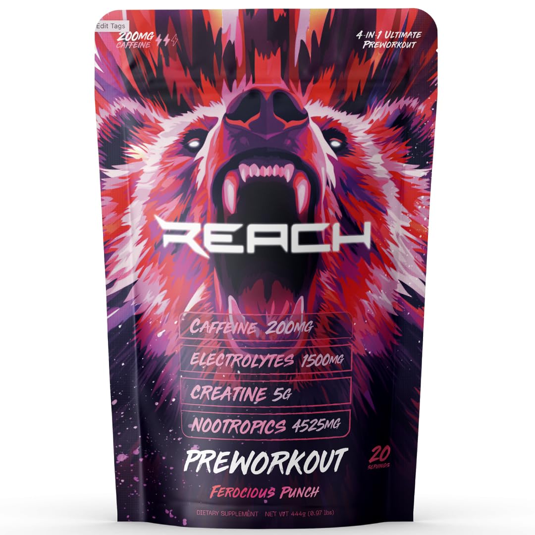 Reach Pre Workout Supplement is the ultimate pre workout for weight loss and performance, designed to fuel your fitness journey with precision. Packed with clinically dosed creatine monohydrate, this pre workout supplement enhances muscle power and ATP production for more intense and effective workouts. The sustained-release caffeine delivers a smooth, consistent energy boost, making it the perfect caffeine pre workout to keep you focused and energized throughout your entire session. Nootropics are included to improve mental clarity, sharpen focus, and increase reaction time, ensuring you're always in the zone. Plus, an advanced electrolyte matrix helps maintain hydration and muscle function, preventing cramps and supporting endurance. With a killer taste, clear mixability, and no fillers or banned substances, Reach Pre Workout is the ideal choice for those looking for a healthy pre workout that delivers results—whether you're targeting weight loss, enhancing performance, or maximizing your overall fitness goals.